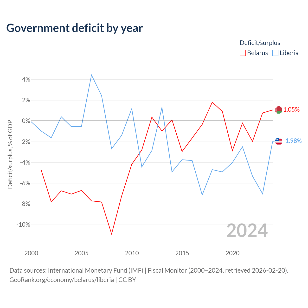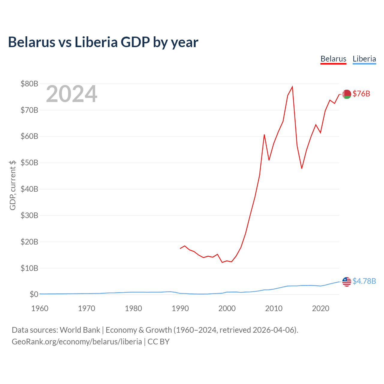 Belarus has a GDP of $76B compared to $4.78B for Liberia, ranking 83/197 and 163/197 by economy size, respectively.