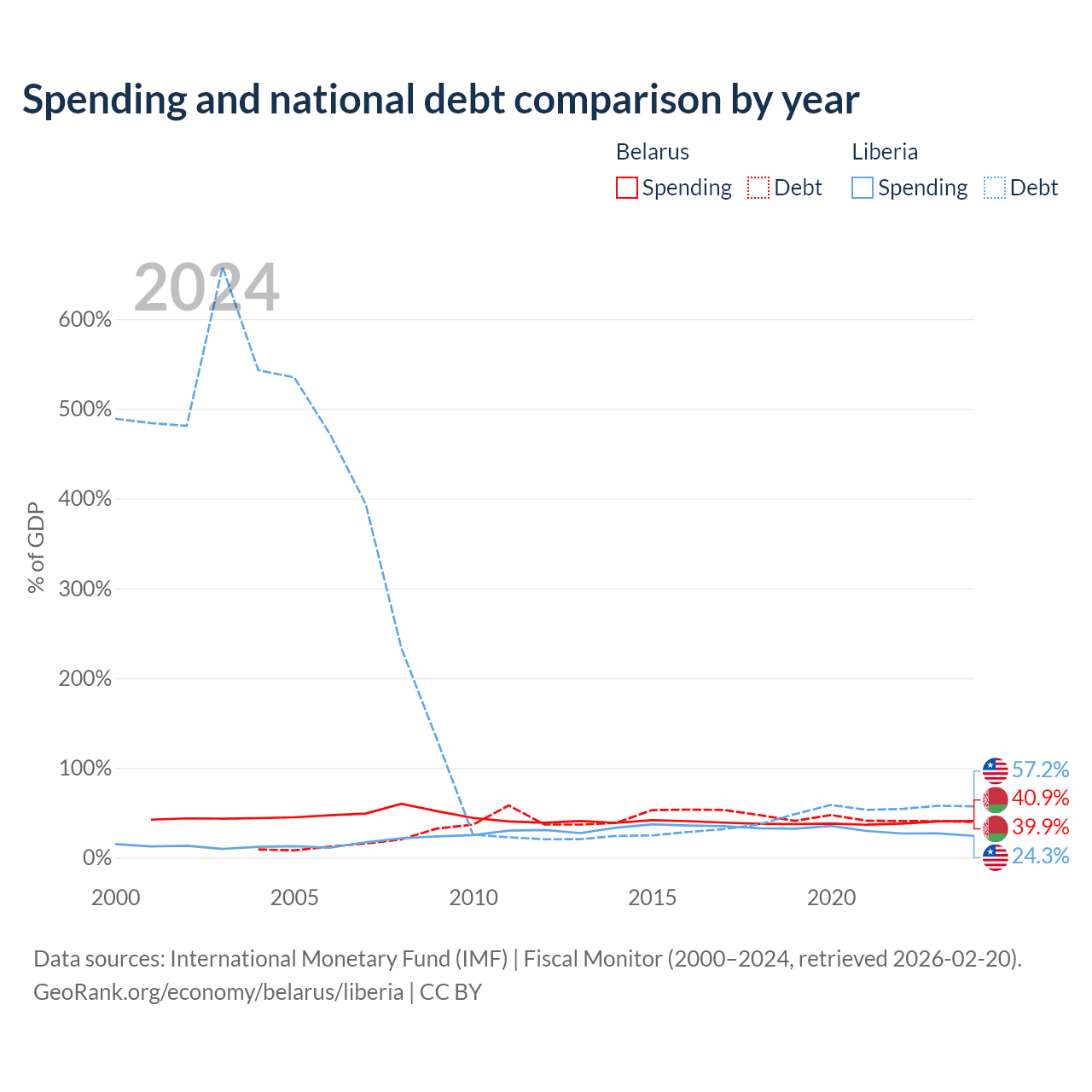 Belarus has $30.3B in government debt (39.9% of GDP), compared to $2.73B (57.2% of GDP) in Liberia.