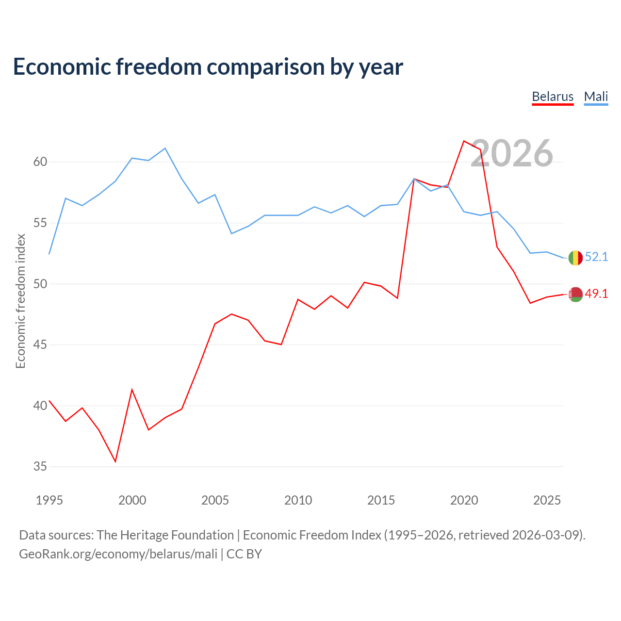 The Economic Freedom Index for Belarus is 49.1, ranking 166/197, compared to 52.1 for Mali, ranking 150/197. The chart above displays a comparison of annual changes in economic freedom indexes.