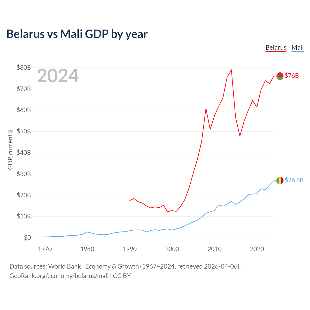 Belarus has a GDP of $76B compared to $26.8B for Mali, ranking 83/197 and 113/197 by economy size, respectively.