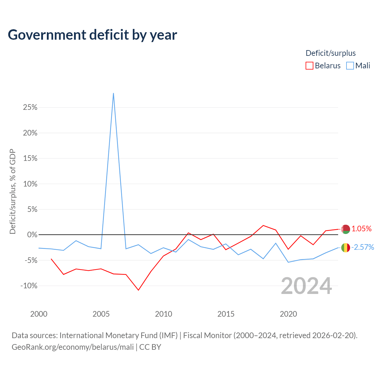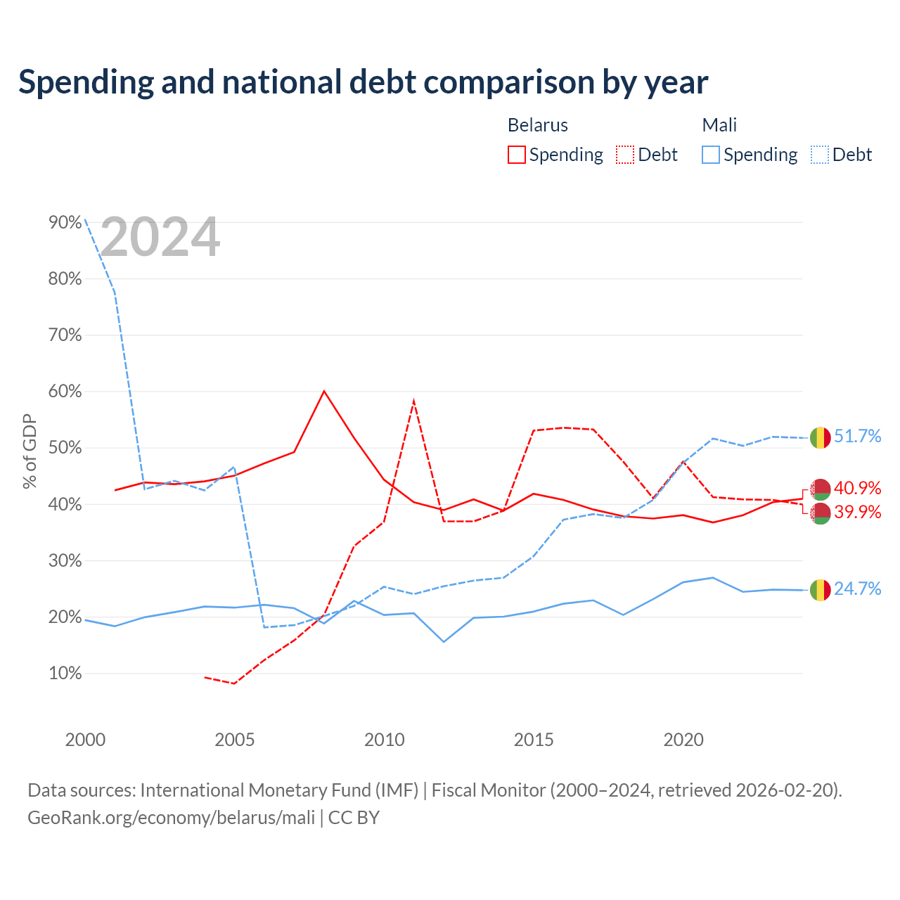 Belarus has $30.3B in government debt (39.9% of GDP), compared to $13.9B (51.7% of GDP) in Mali.