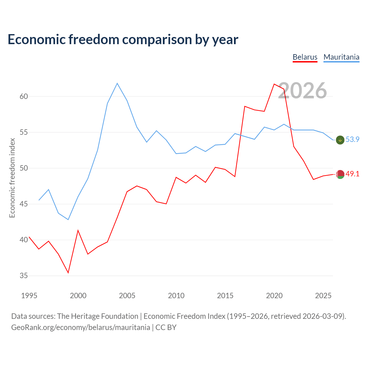 The Economic Freedom Index for Belarus is 49.1, ranking 166/197, compared to 53.9 for Mauritania, ranking 136/197. The chart above displays a comparison of annual changes in economic freedom indexes.