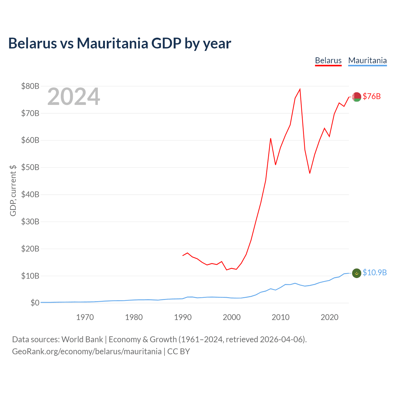 Belarus has a GDP of $76B compared to $10.9B for Mauritania, ranking 83/197 and 153/197 by economy size, respectively.