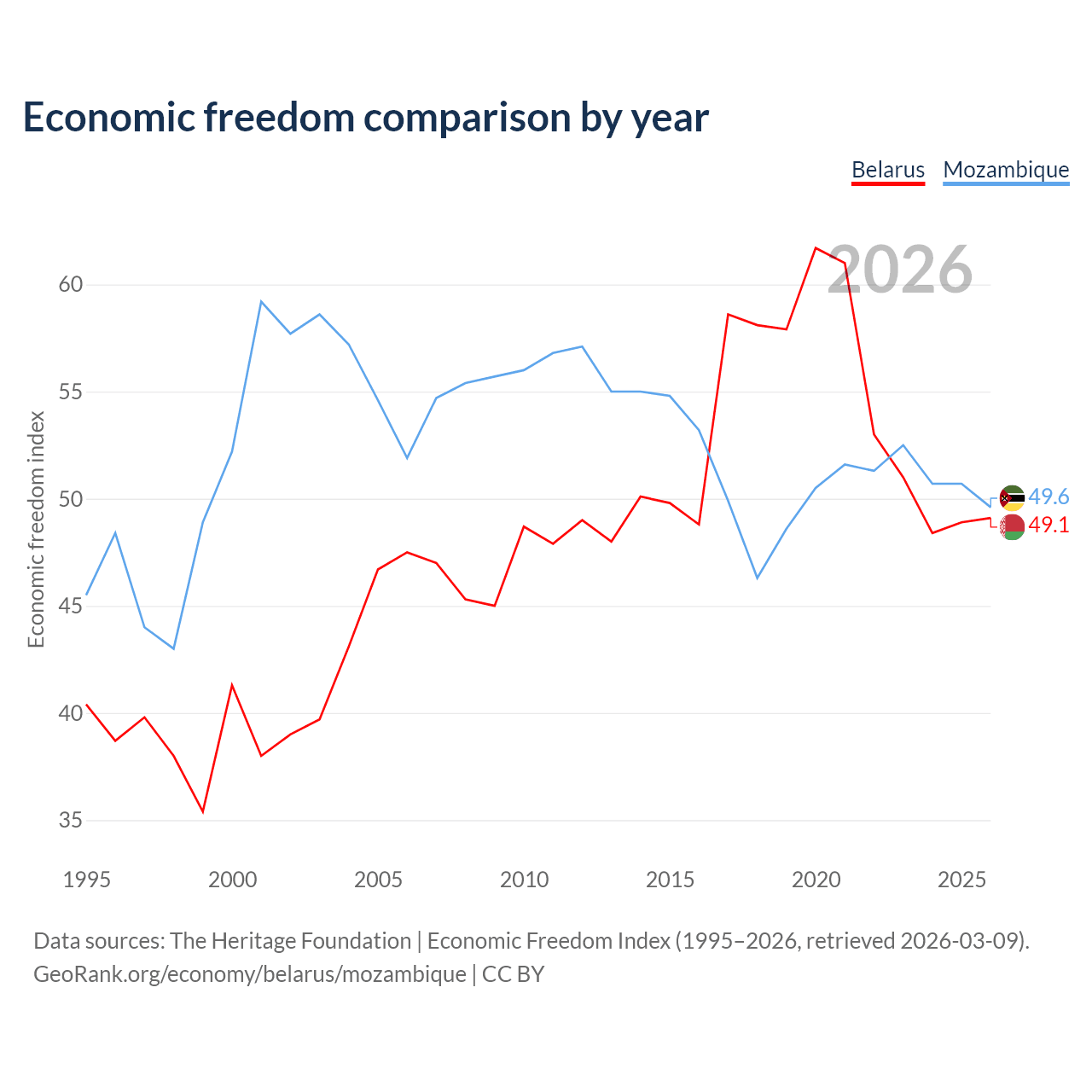 The Economic Freedom Index for Belarus is 49.1, ranking 166/197, compared to 49.6 for Mozambique, ranking 164/197. The chart above displays a comparison of annual changes in economic freedom indexes.