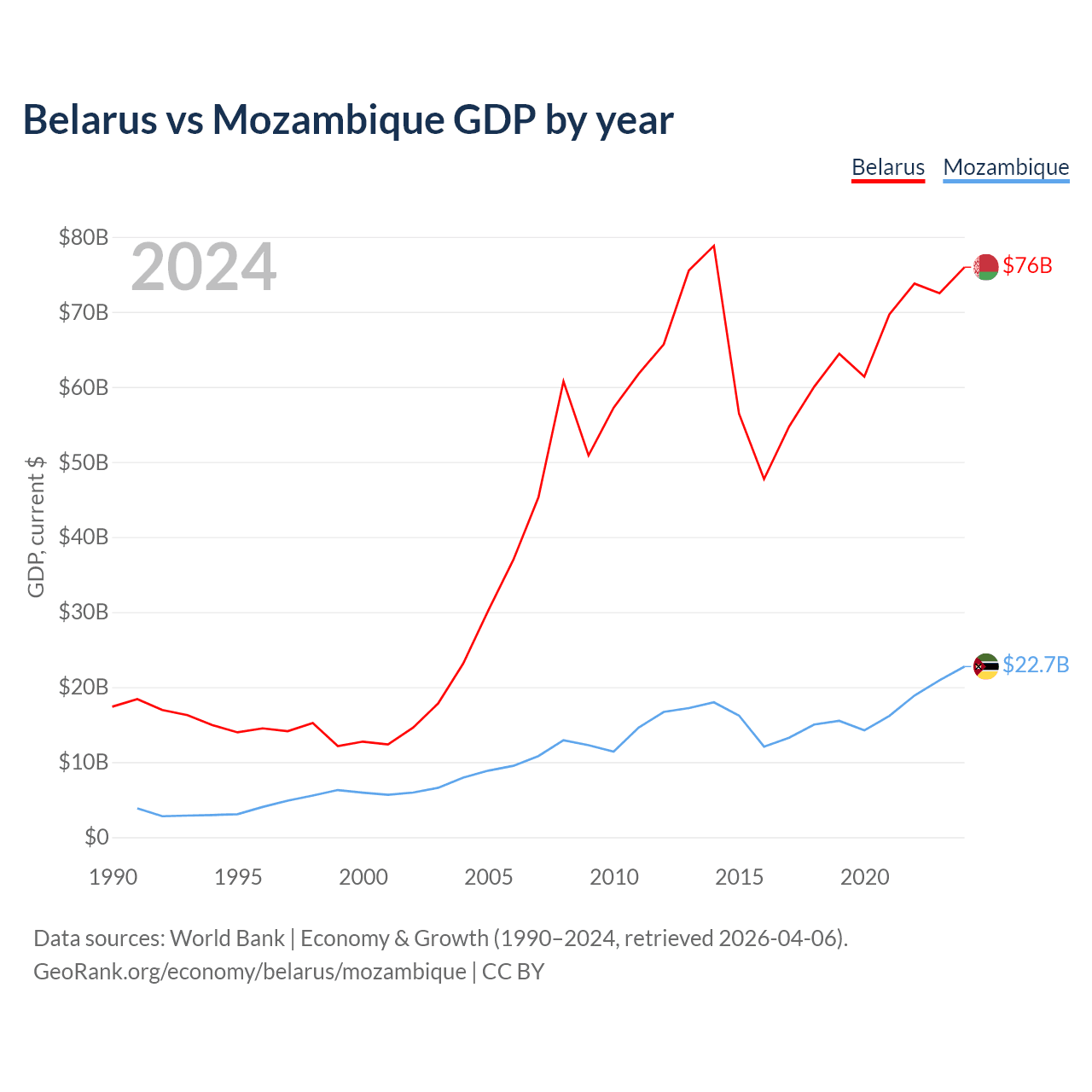 Belarus has a GDP of $76B compared to $22.7B for Mozambique, ranking 83/197 and 123/197 by economy size, respectively.