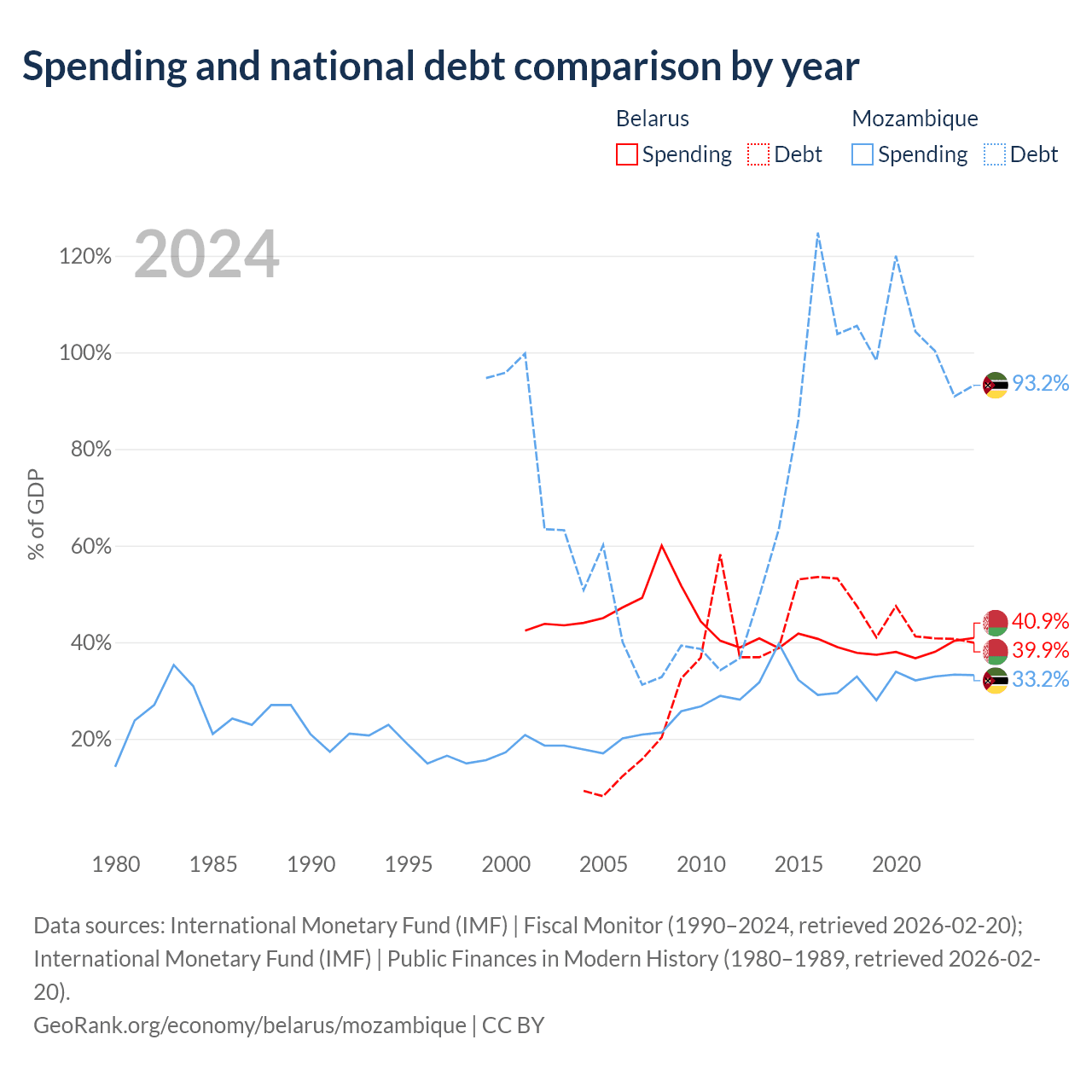 Belarus has $30.3B in government debt (39.9% of GDP), compared to $21.2B (93.2% of GDP) in Mozambique.