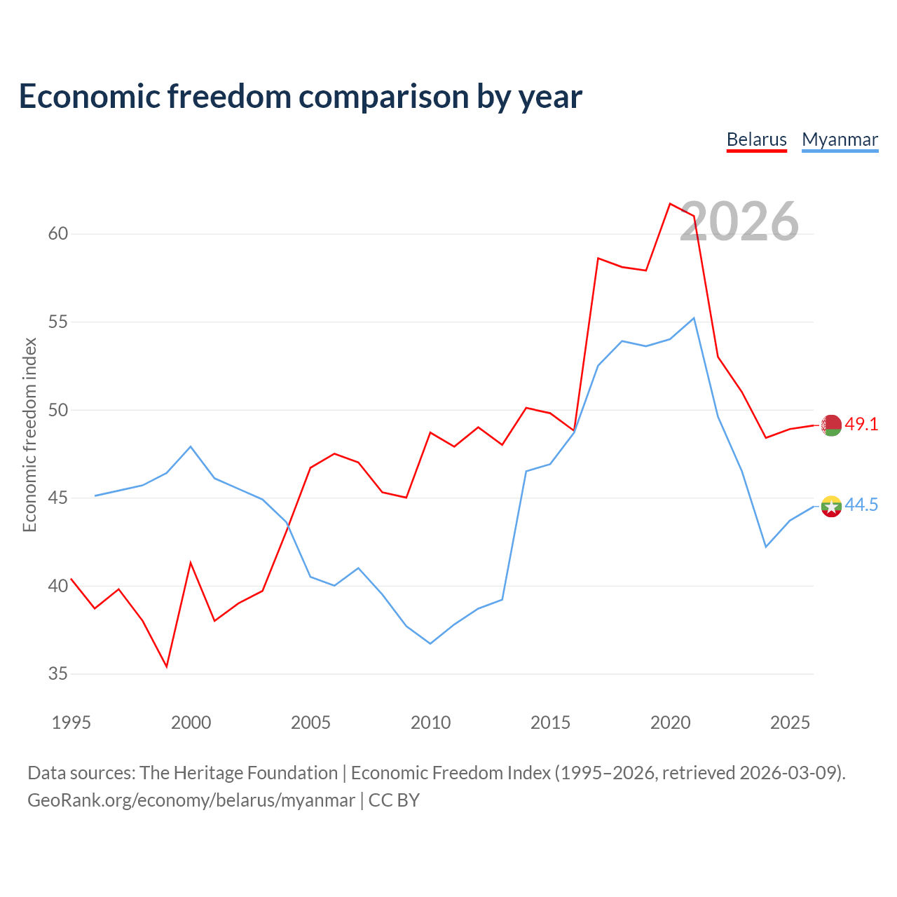 The Economic Freedom Index for Belarus is 49.1, ranking 166/197, compared to 44.5 for Myanmar, ranking 180/197. The chart above displays a comparison of annual changes in economic freedom indexes.