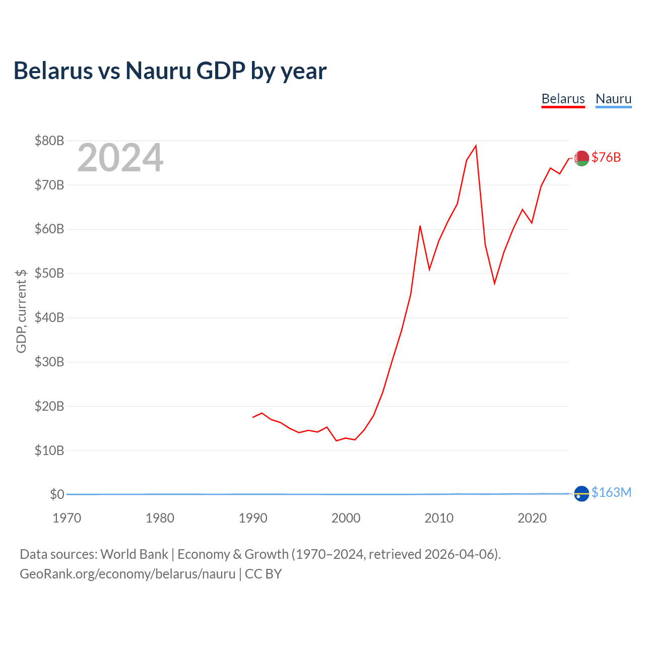 Belarus has a GDP of $76B compared to $163M for Nauru, ranking 83/197 and 195/197 by economy size, respectively.