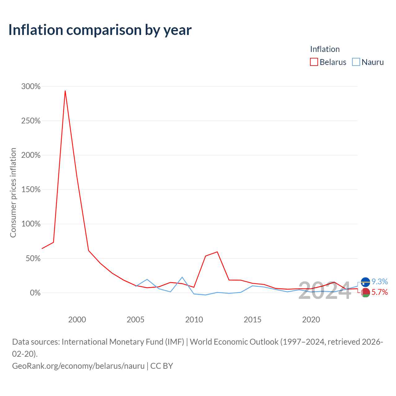 Over the past 20 years, Belarus has recorded an average annual inflation rate of 14.6%, compared with 4.84% in Nauru. In 2024, inflation was 5.7% in Belarus and 9.3% in Nauru.