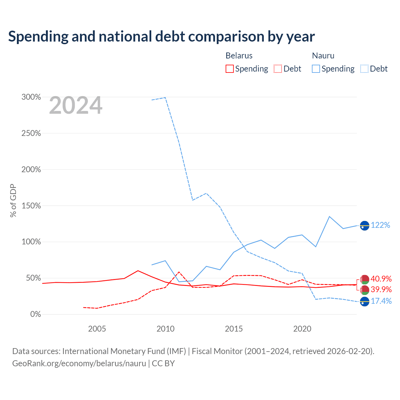 Belarus has $30.3B in government debt (39.9% of GDP), compared to $28.3M (17.4% of GDP) in Nauru.