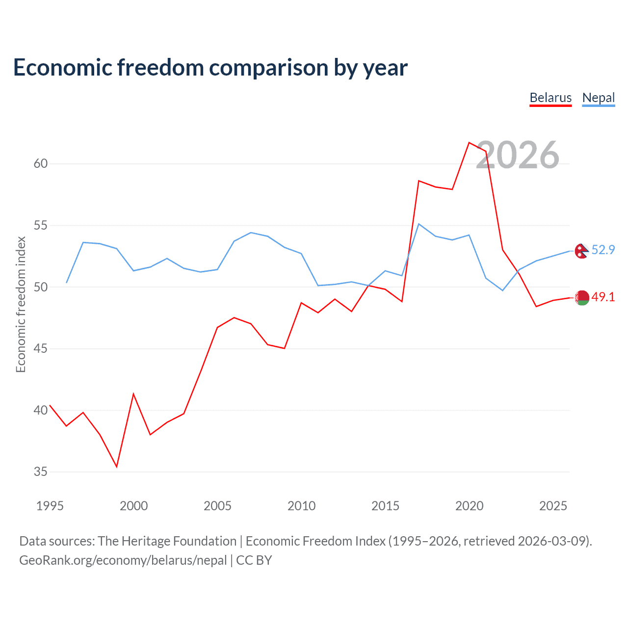 The Economic Freedom Index for Belarus is 49.1, ranking 166/197, compared to 52.9 for Nepal, ranking 144/197. The chart above displays a comparison of annual changes in economic freedom indexes.