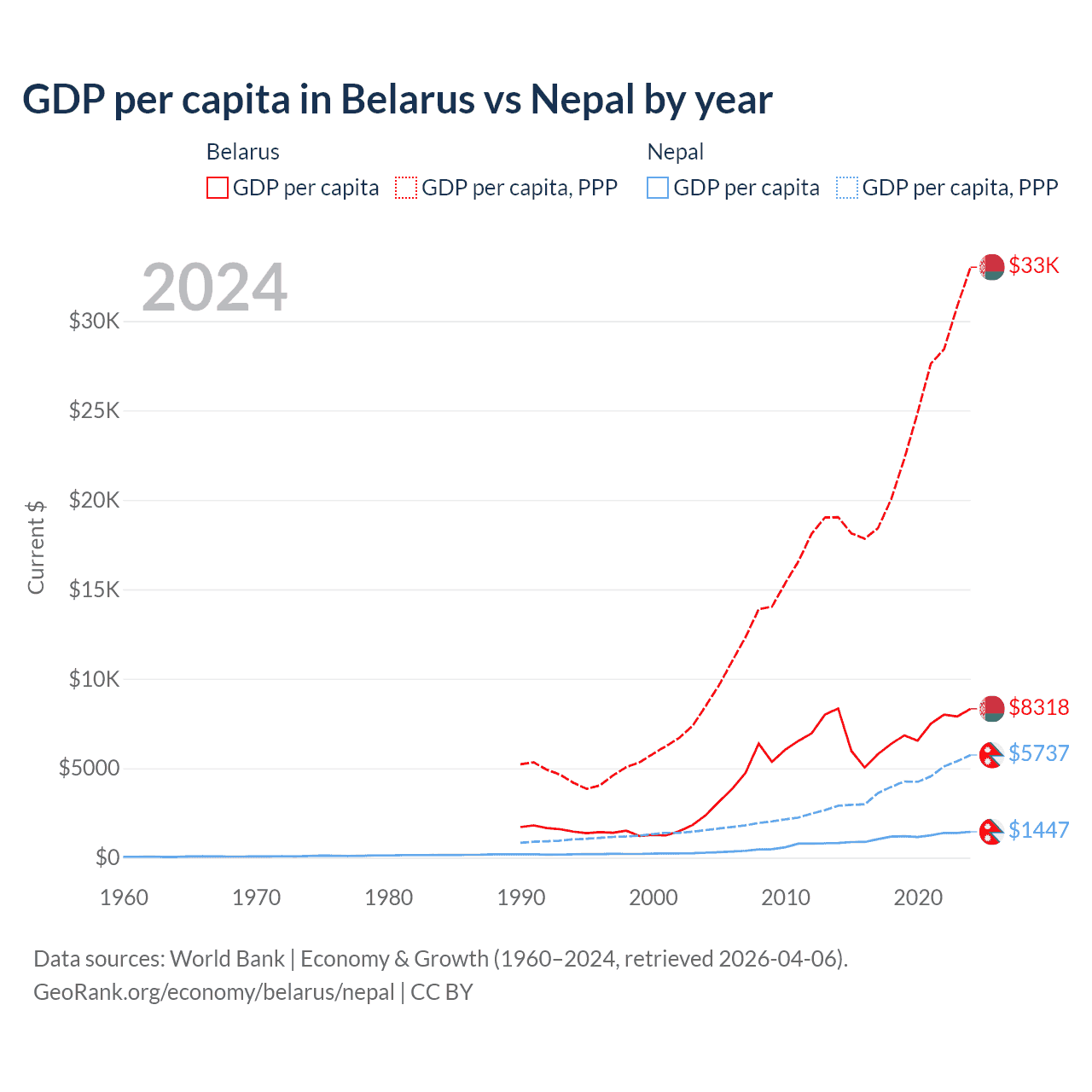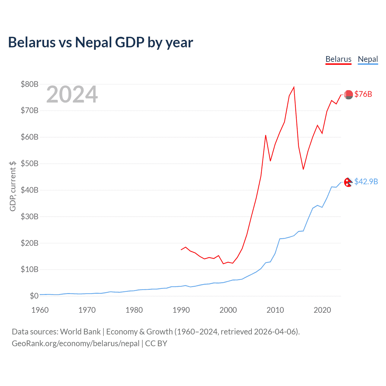 Belarus has a GDP of $76B compared to $42.9B for Nepal, ranking 83/197 and 101/197 by economy size, respectively.