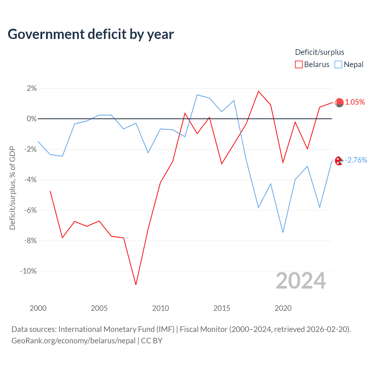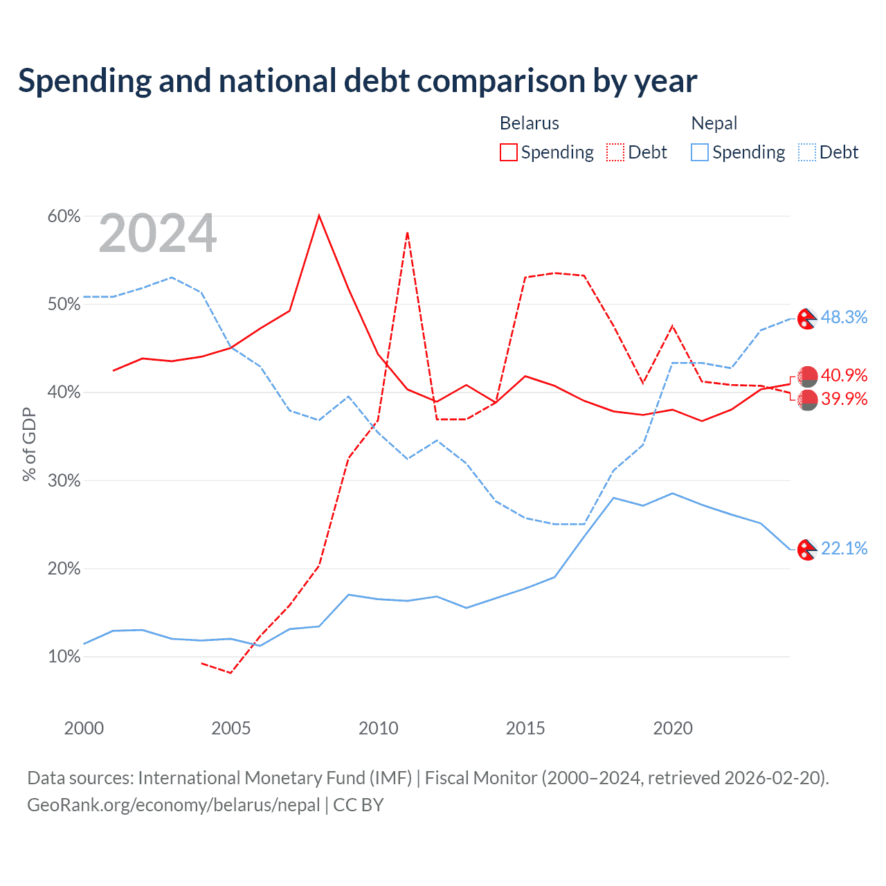 Belarus has $30.3B in government debt (39.9% of GDP), compared to $20.7B (48.3% of GDP) in Nepal.