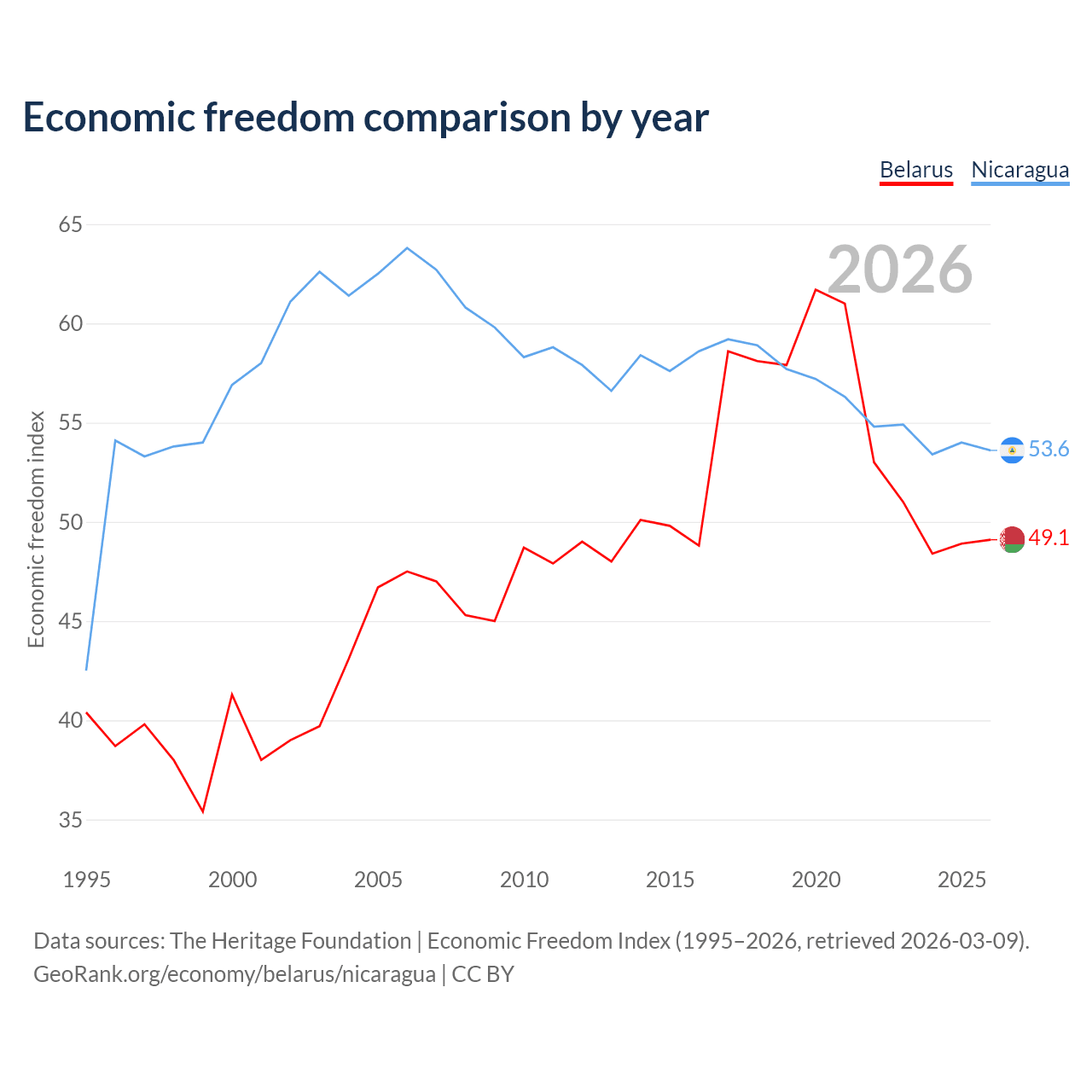 The Economic Freedom Index for Belarus is 49.1, ranking 166/197, compared to 53.6 for Nicaragua, ranking 139/197. The chart above displays a comparison of annual changes in economic freedom indexes.