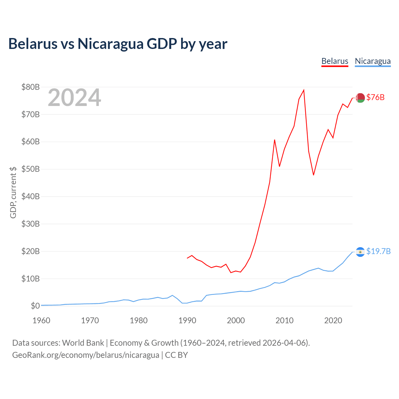 Belarus has a GDP of $76B compared to $19.7B for Nicaragua, ranking 83/197 and 131/197 by economy size, respectively.