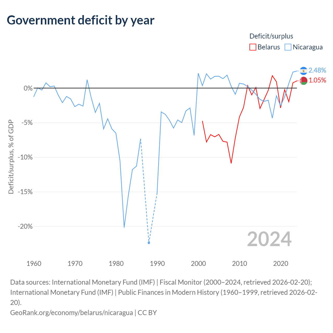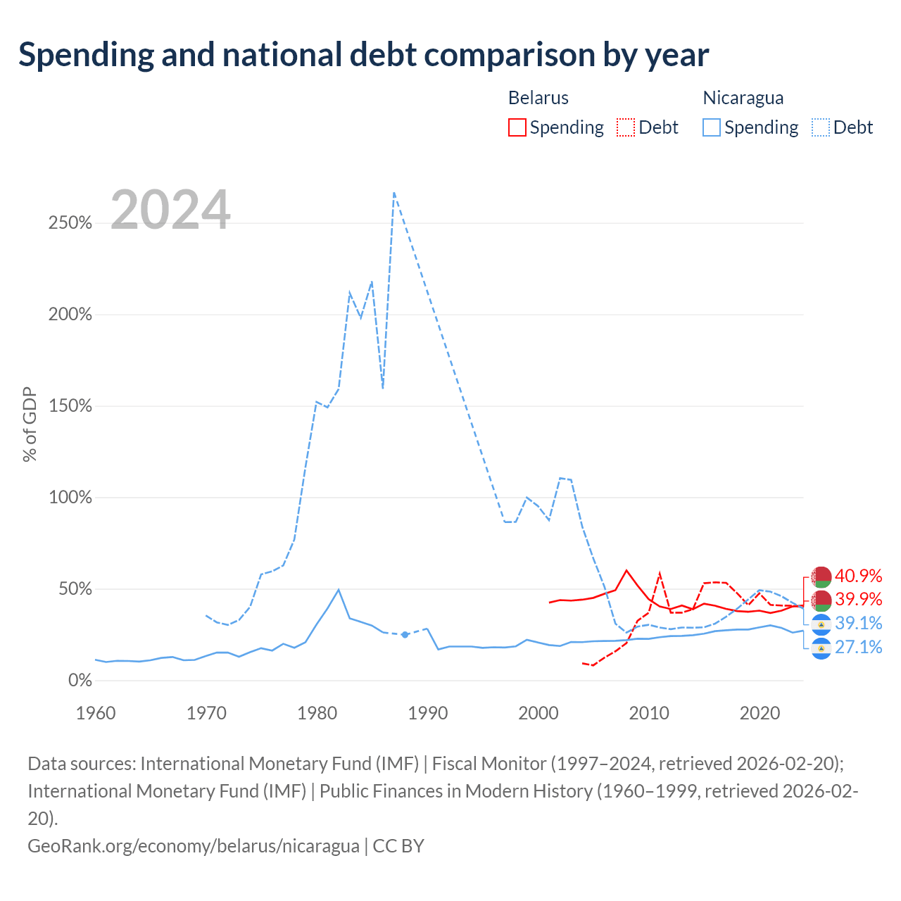 Belarus has $30.3B in government debt (39.9% of GDP), compared to $7.71B (39.1% of GDP) in Nicaragua.
