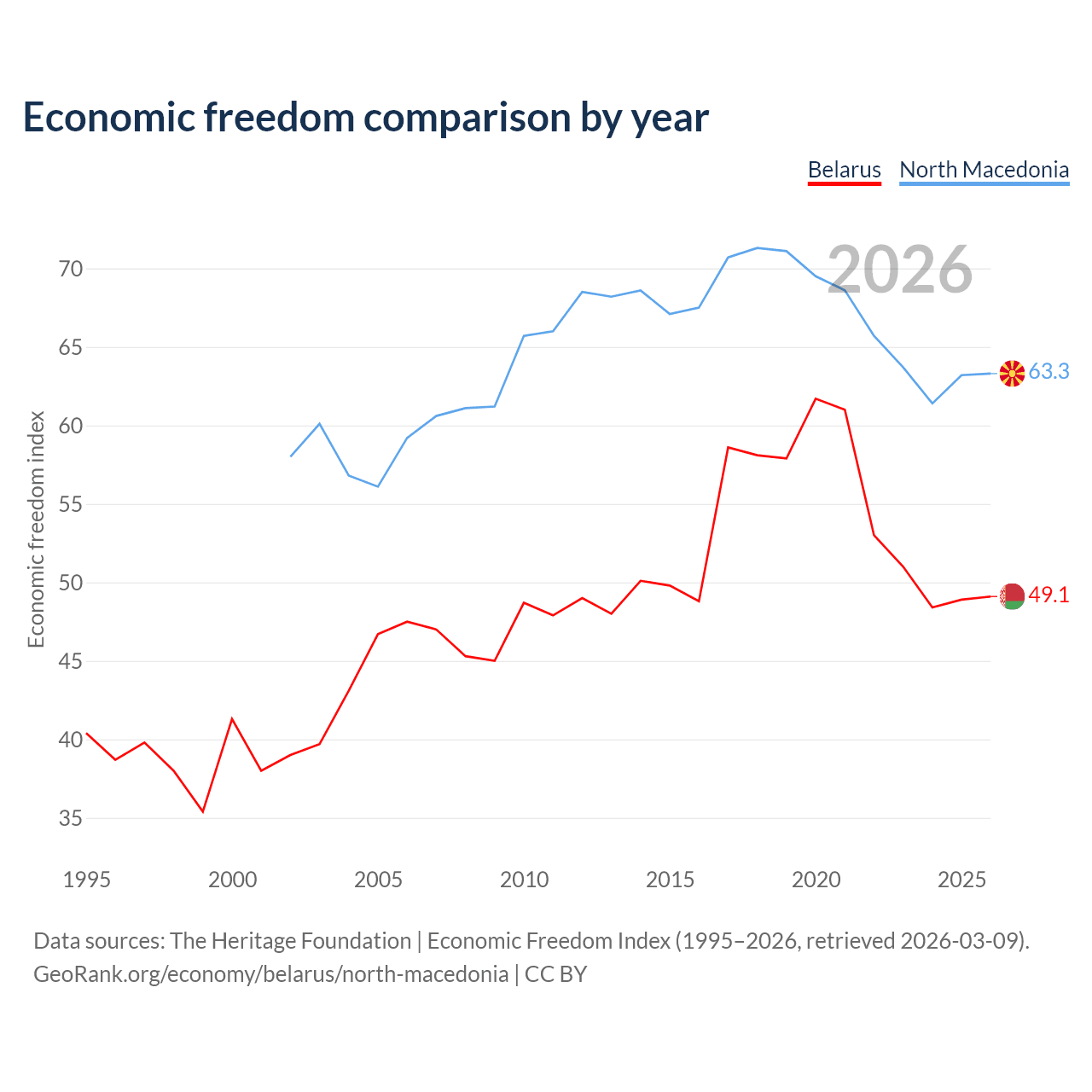 The Economic Freedom Index for Belarus is 49.1, ranking 166/197, compared to 63.3 for North Macedonia, ranking 81/197. The chart above displays a comparison of annual changes in economic freedom indexes.