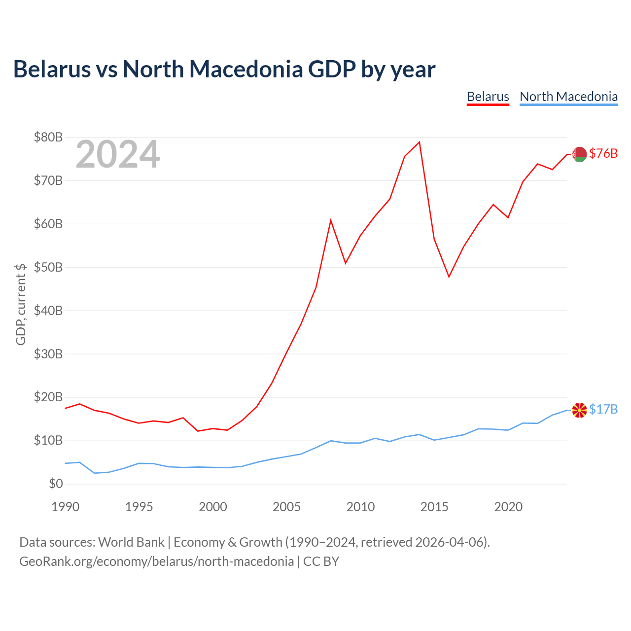 Belarus has a GDP of $76B compared to $17B for North Macedonia, ranking 83/197 and 138/197 by economy size, respectively.