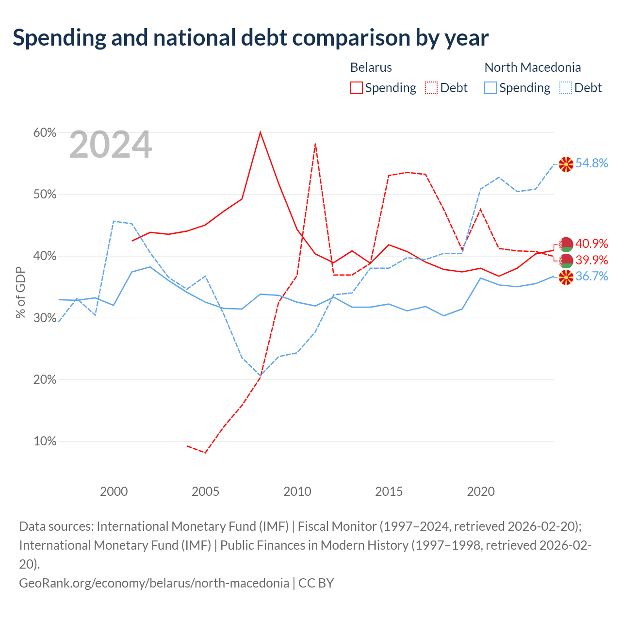Belarus has $30.3B in government debt (39.9% of GDP), compared to $9.3B (54.8% of GDP) in North Macedonia.