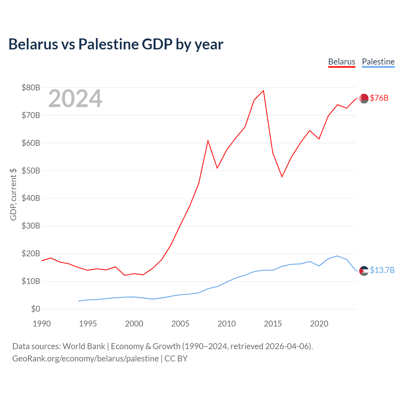 Belarus vs Palestine GDP by year