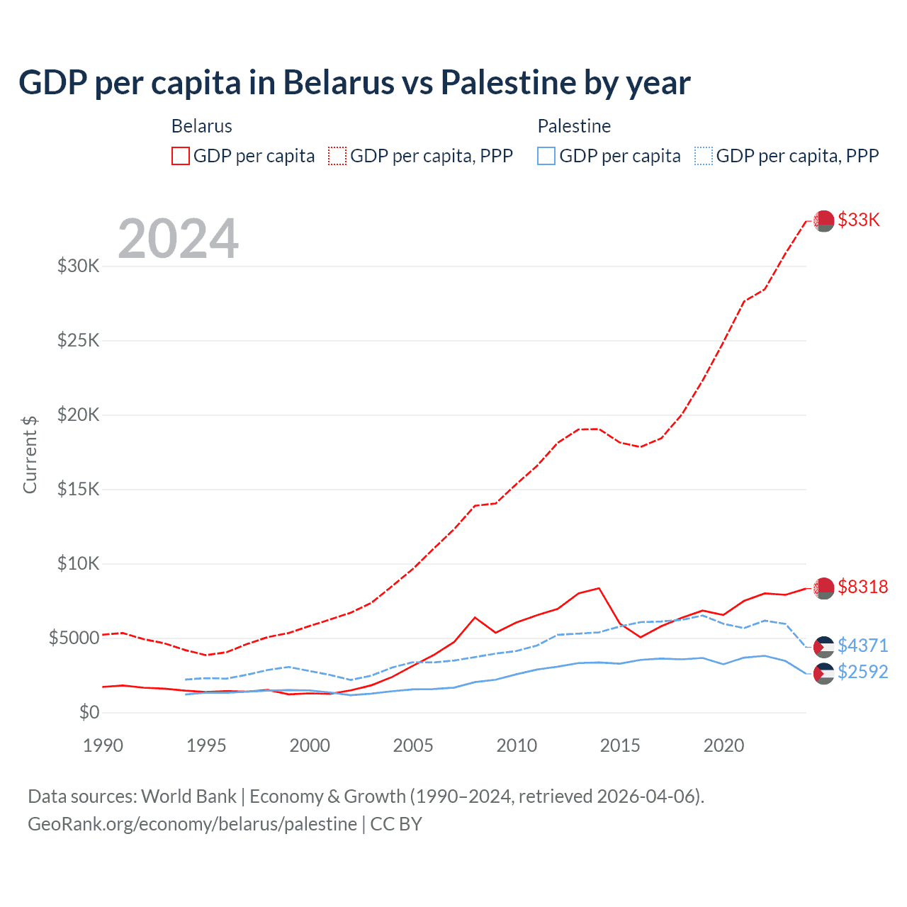 GDP per capita in Belarus vs Palestine by year