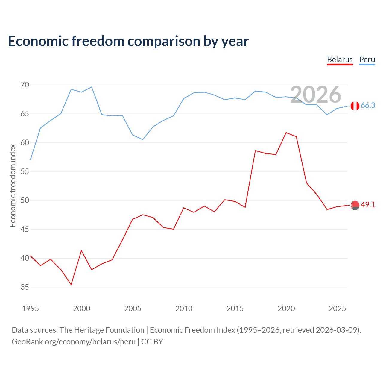 The Economic Freedom Index for Belarus is 49.1, ranking 166/197, compared to 66.3 for Peru, ranking 62/197. The chart above displays a comparison of annual changes in economic freedom indexes.