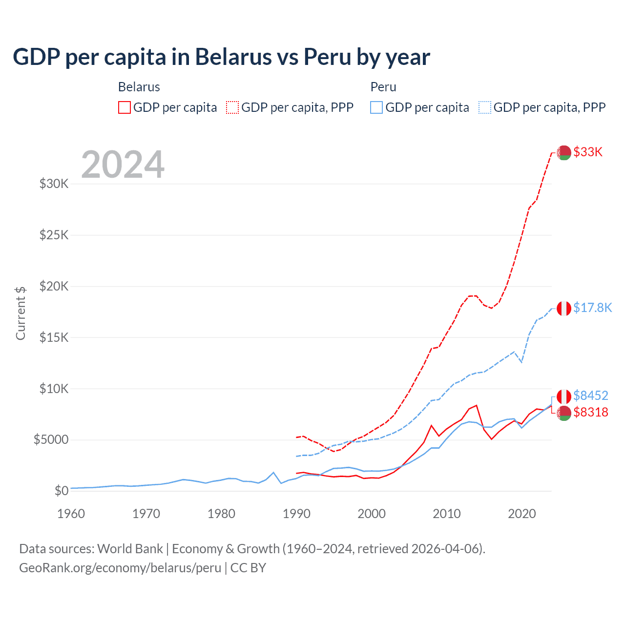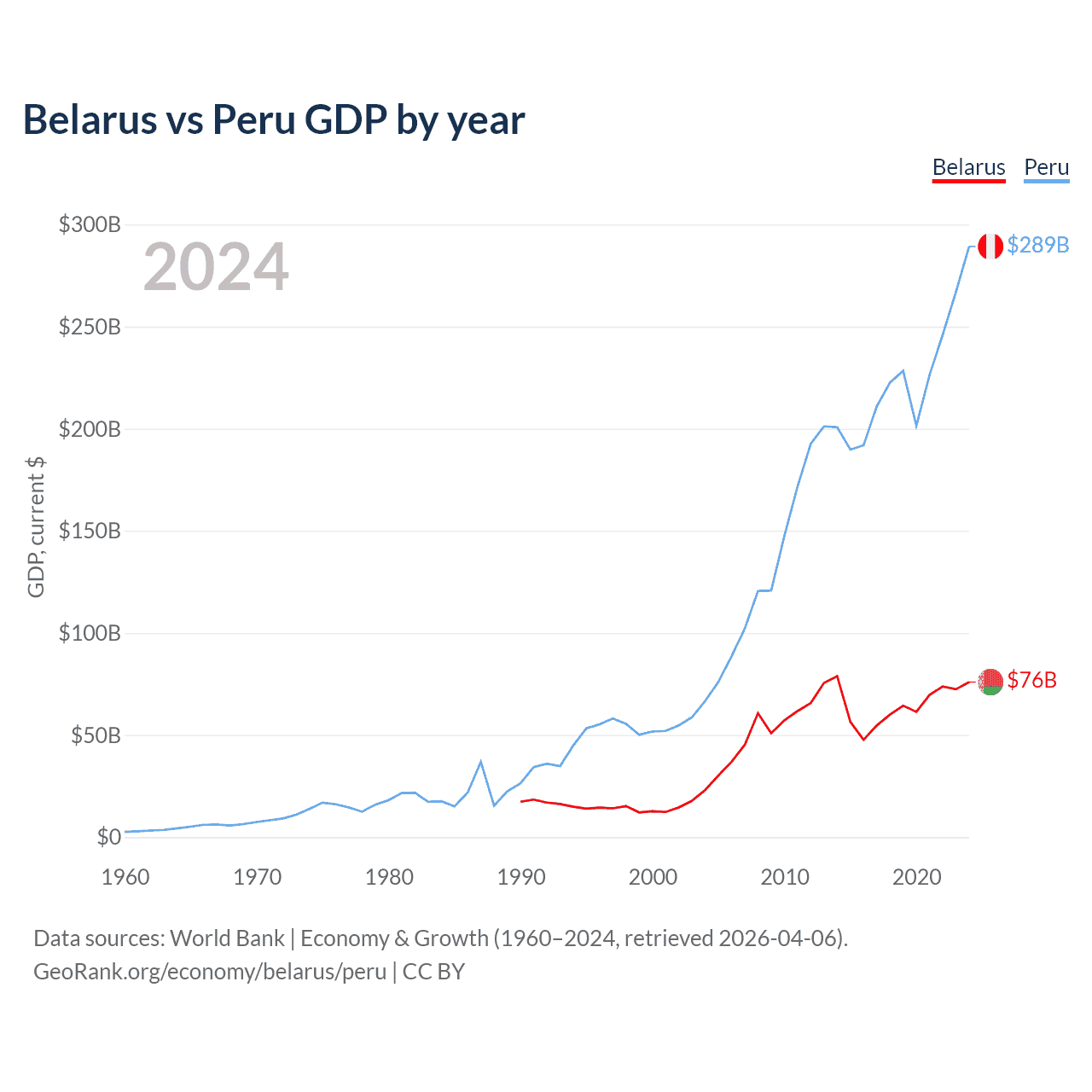 Belarus has a GDP of $76B compared to $289B for Peru, ranking 83/197 and 49/197 by economy size, respectively.