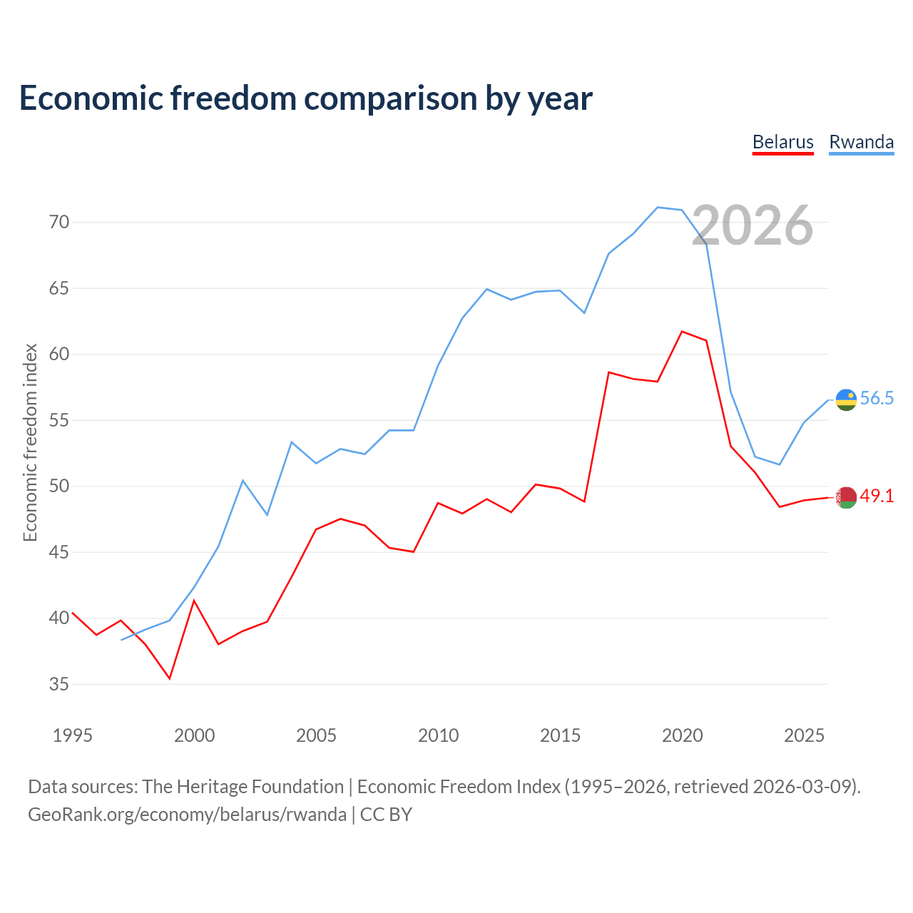 The Economic Freedom Index for Belarus is 49.1, ranking 166/197, compared to 56.5 for Rwanda, ranking 121/197. The chart above displays a comparison of annual changes in economic freedom indexes.