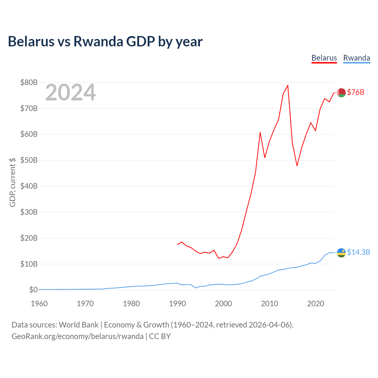 Belarus has a GDP of $76B compared to $14.3B for Rwanda, ranking 83/197 and 144/197 by economy size, respectively.