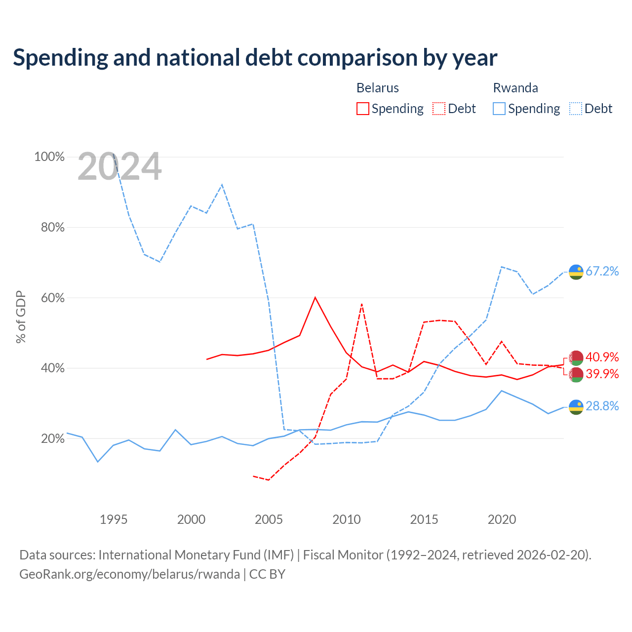 Belarus has $30.3B in government debt (39.9% of GDP), compared to $9.58B (67.2% of GDP) in Rwanda.