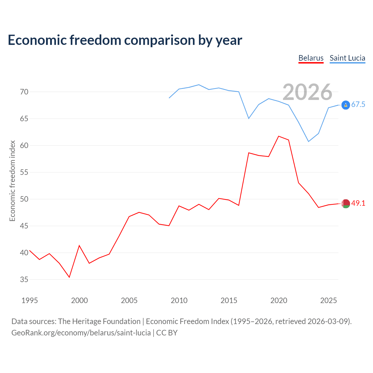 The Economic Freedom Index for Belarus is 49.1, ranking 166/197, compared to 67.5 for Saint Lucia, ranking 57/197. The chart above displays a comparison of annual changes in economic freedom indexes.