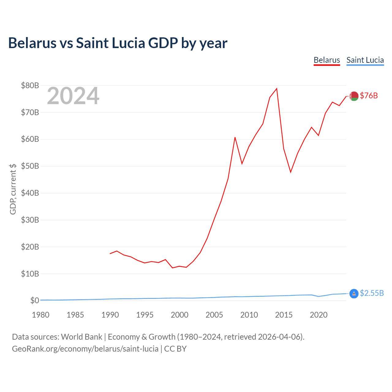 Belarus has a GDP of $76B compared to $2.55B for Saint Lucia, ranking 83/197 and 173/197 by economy size, respectively.