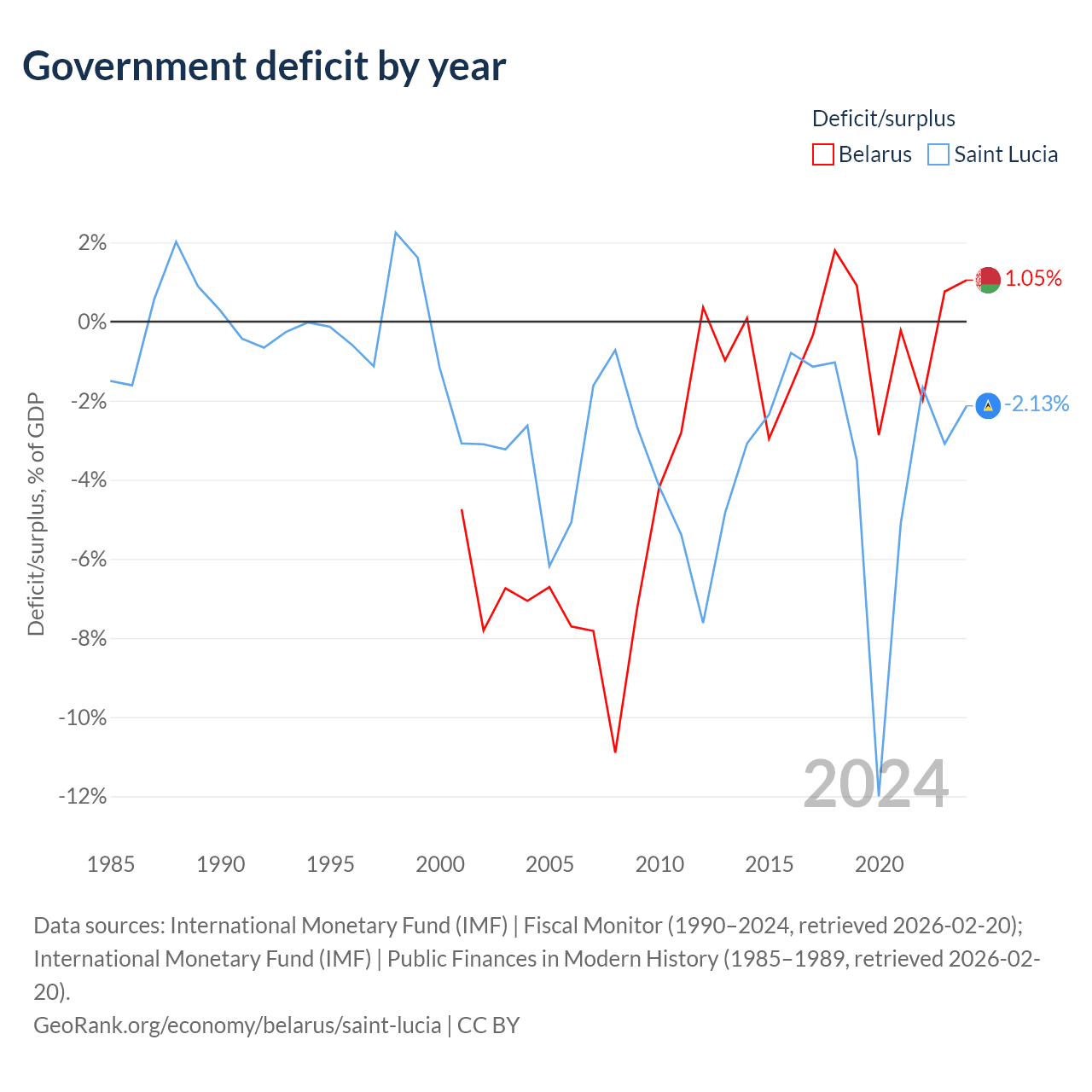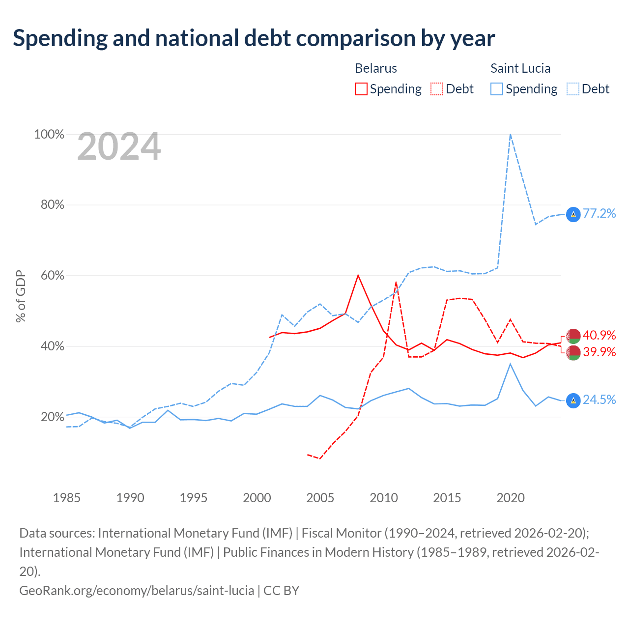 Belarus has $30.3B in government debt (39.9% of GDP), compared to $1.97B (77.2% of GDP) in Saint Lucia.