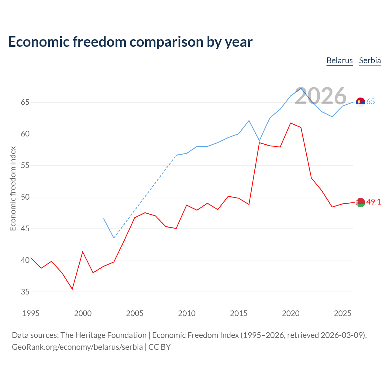 The Economic Freedom Index for Belarus is 49.1, ranking 166/197, compared to 65 for Serbia, ranking 68/197. The chart above displays a comparison of annual changes in economic freedom indexes.