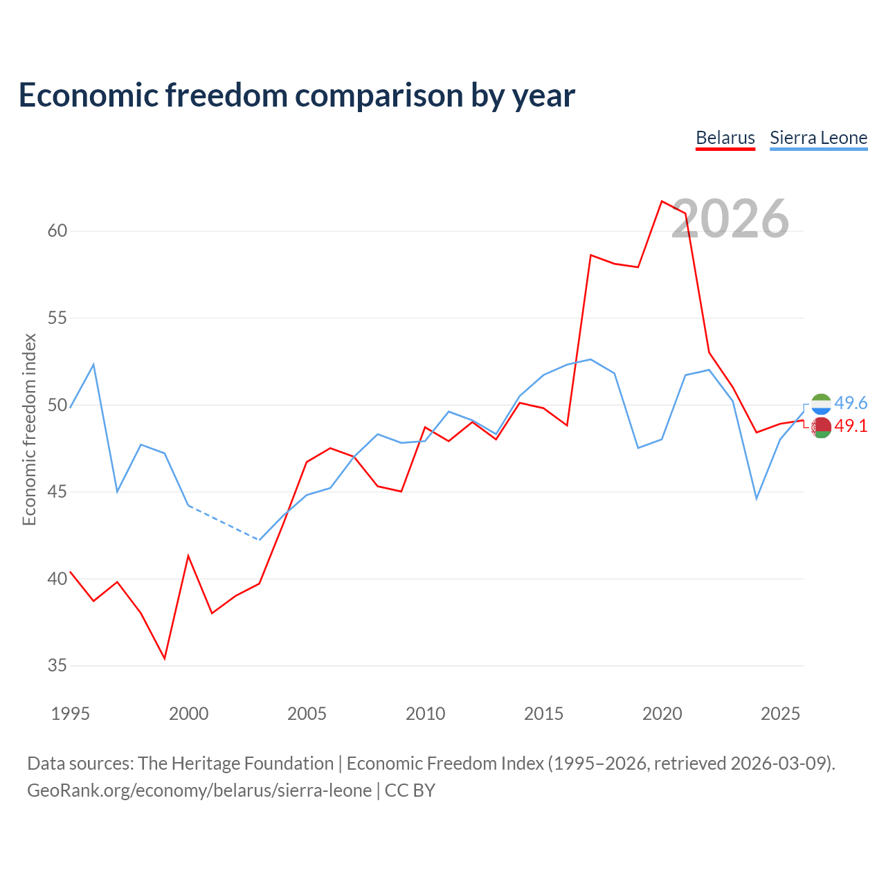 The Economic Freedom Index for Belarus is 49.1, ranking 166/197, compared to 49.6 for Sierra Leone, ranking 165/197. The chart above displays a comparison of annual changes in economic freedom indexes.