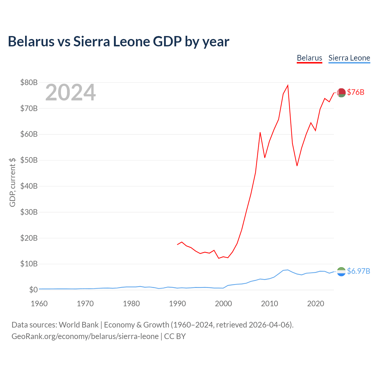Belarus has a GDP of $76B compared to $6.97B for Sierra Leone, ranking 83/197 and 160/197 by economy size, respectively.