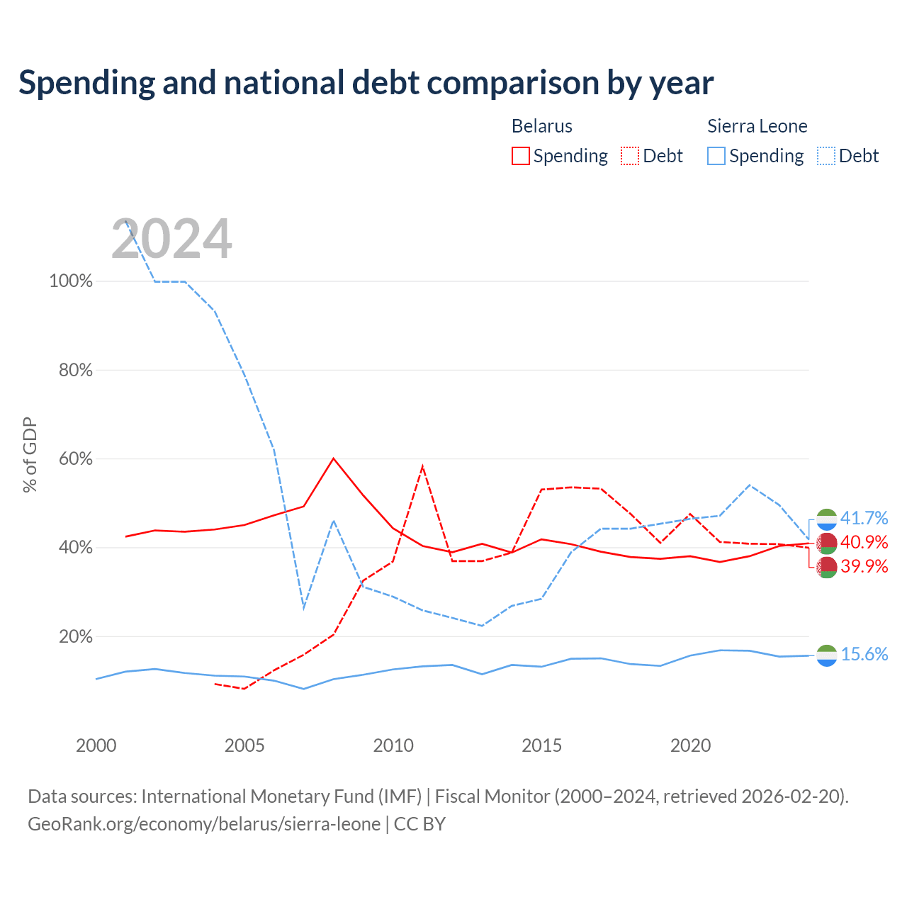 Belarus has $30.3B in government debt (39.9% of GDP), compared to $2.91B (41.7% of GDP) in Sierra Leone.