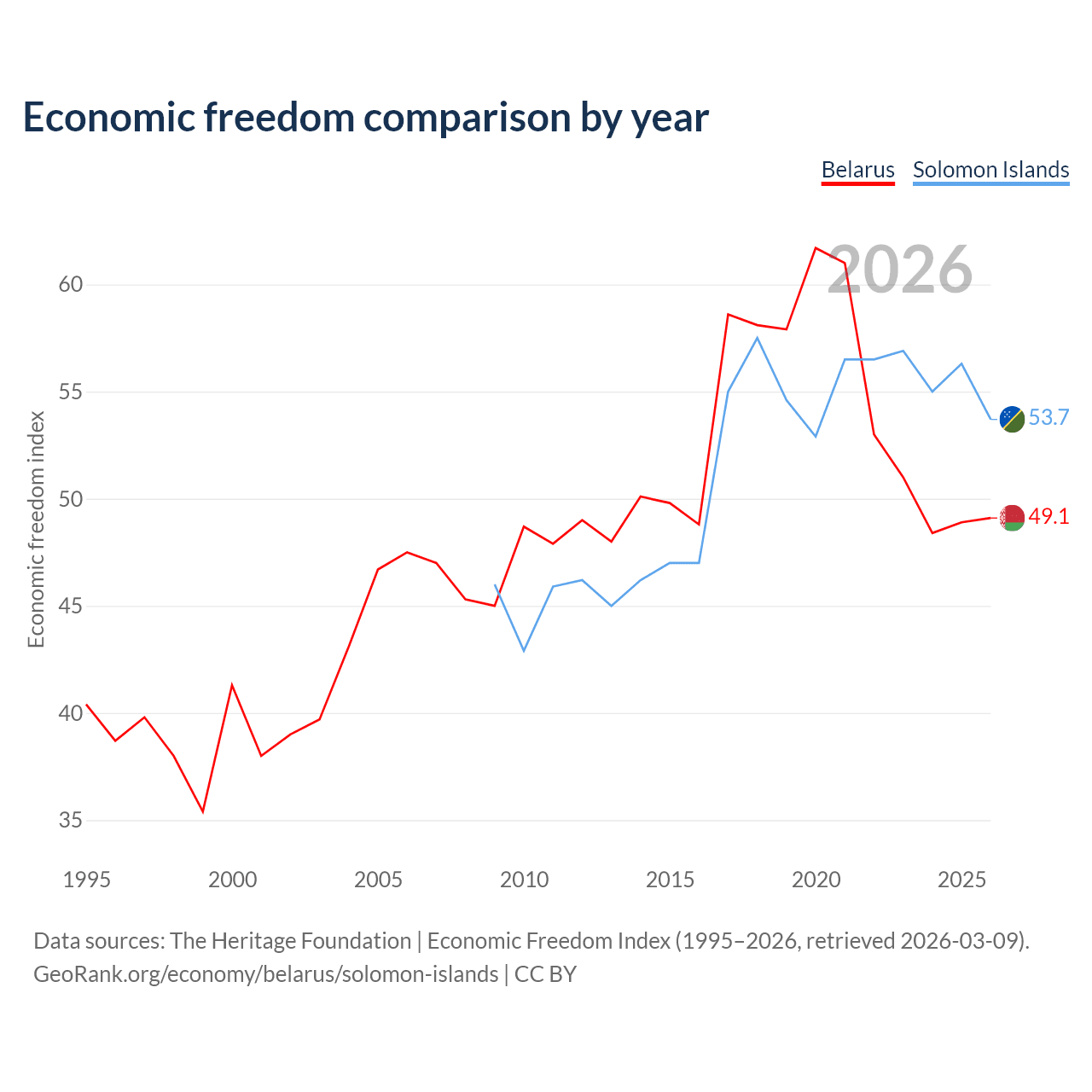 The Economic Freedom Index for Belarus is 49.1, ranking 166/197, compared to 53.7 for the Solomon Islands, ranking 137/197. The chart above displays a comparison of annual changes in economic freedom indexes.