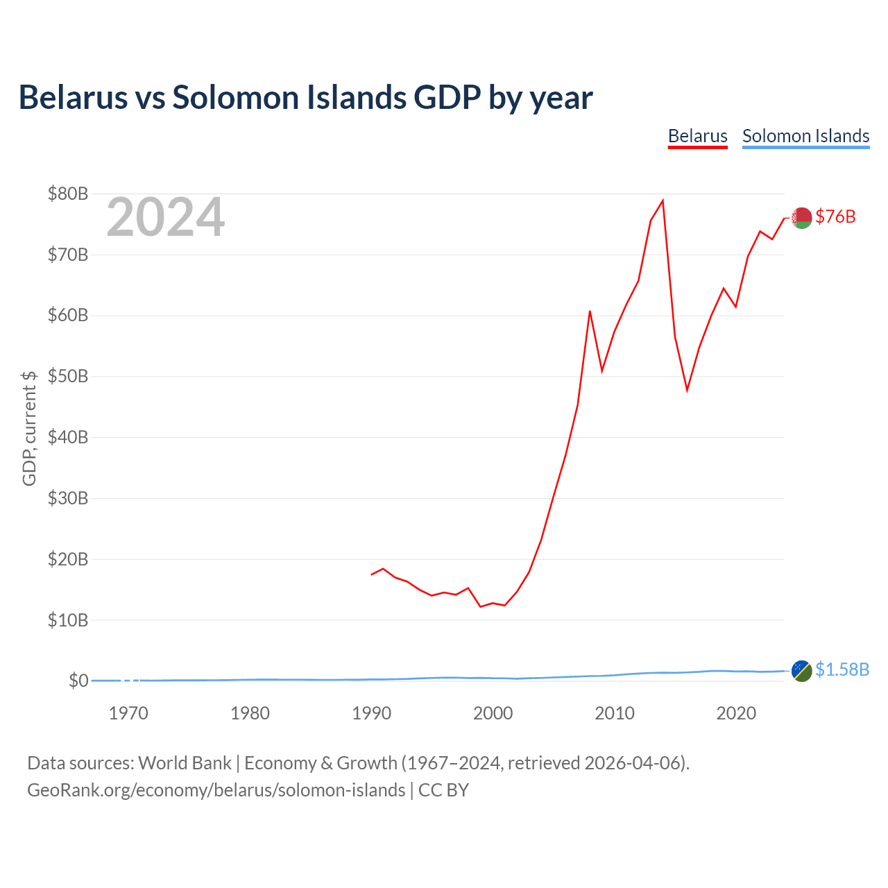Belarus has a GDP of $76B compared to $1.58B for the Solomon Islands, ranking 83/197 and 182/197 by economy size, respectively.