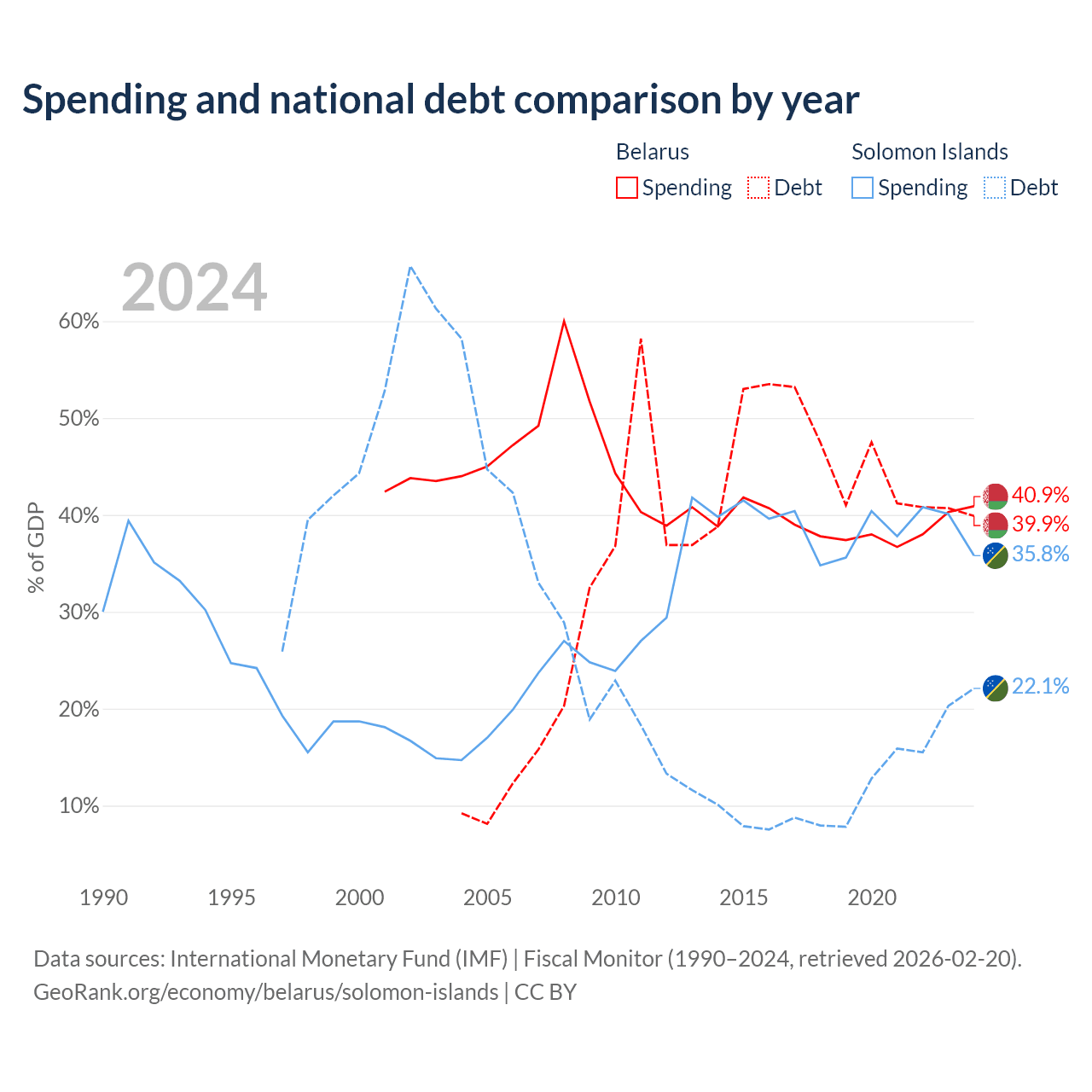 Belarus has $30.3B in government debt (39.9% of GDP), compared to $350M (22.1% of GDP) in the Solomon Islands.