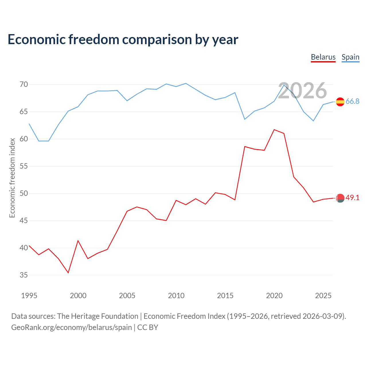 The Economic Freedom Index for Belarus is 49.1, ranking 166/197, compared to 66.8 for Spain, ranking 59/197. The chart above displays a comparison of annual changes in economic freedom indexes.
