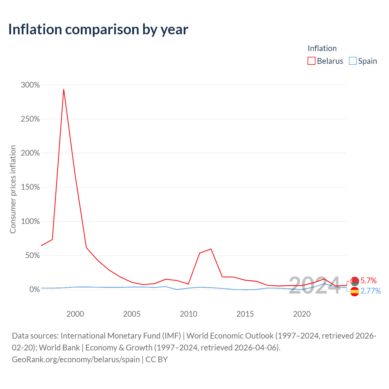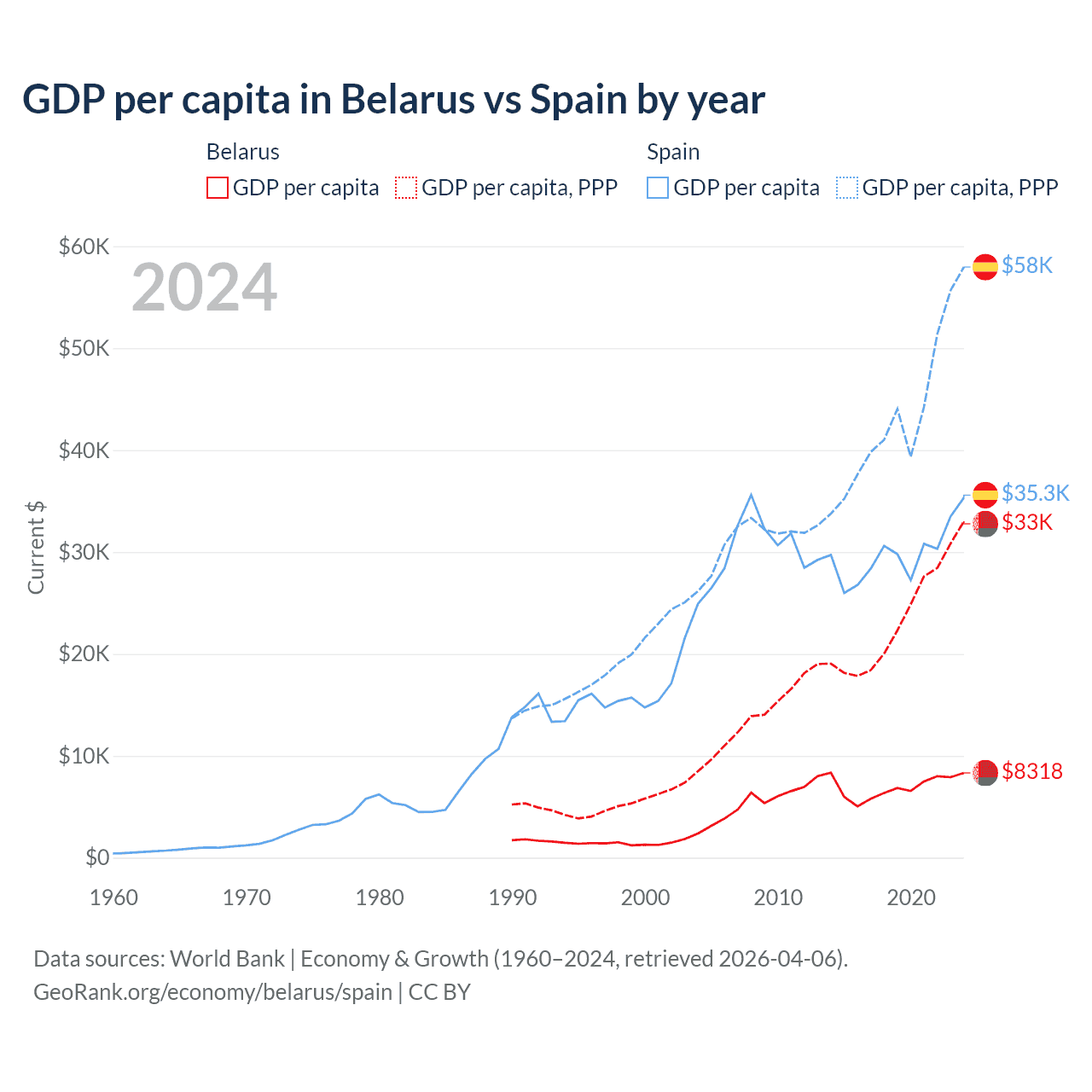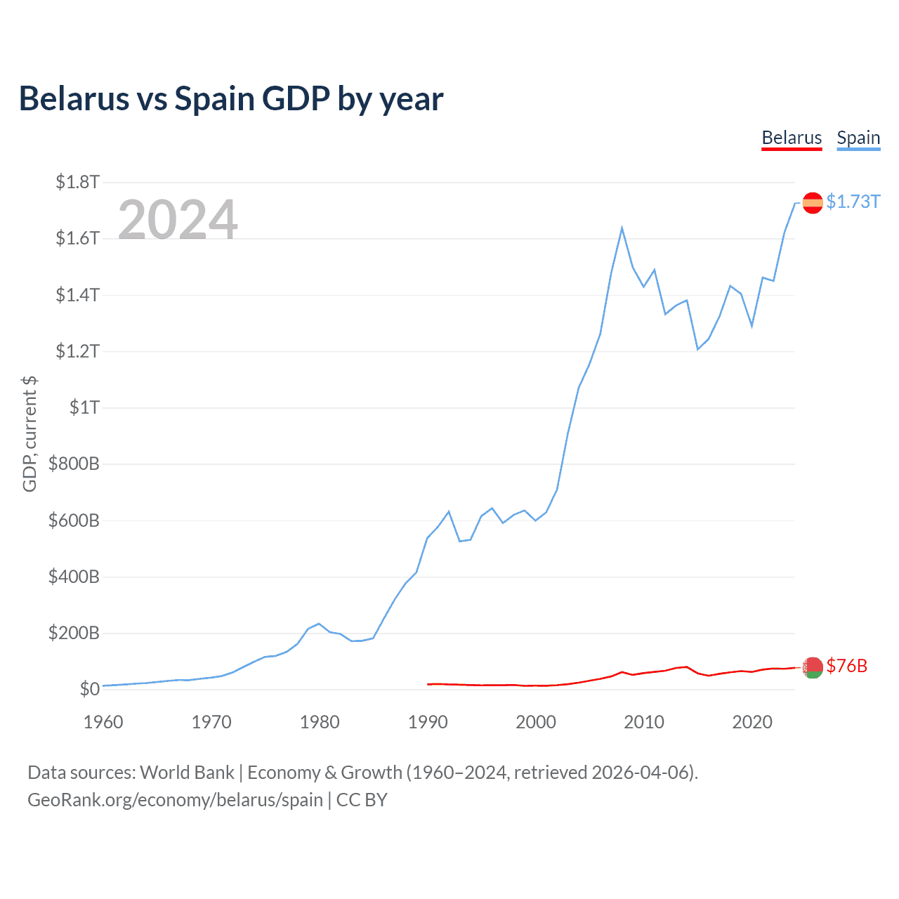 Belarus has a GDP of $76B compared to $1.73T for Spain, ranking 83/197 and 15/197 by economy size, respectively.