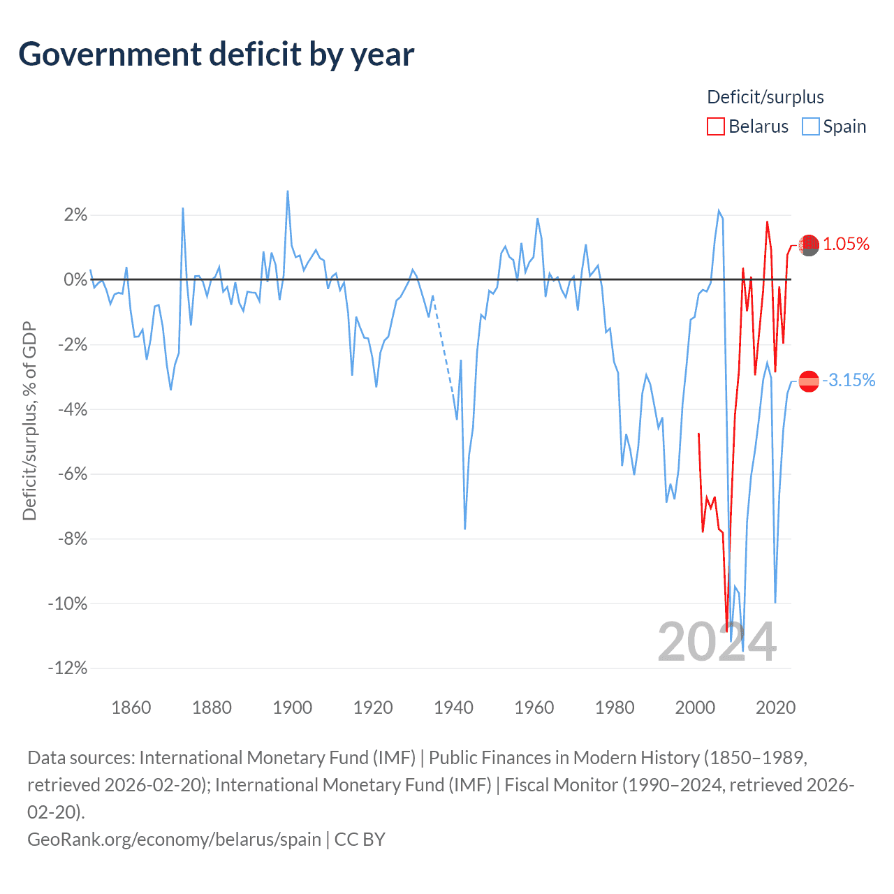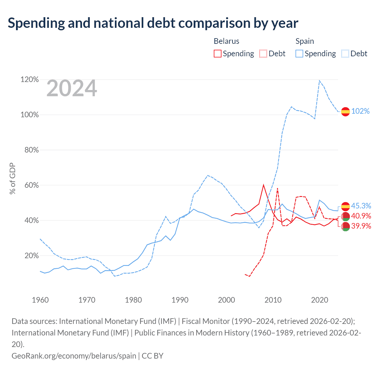 Belarus has $30.3B in government debt (39.9% of GDP), compared to $1.75T (101.6% of GDP) in Spain.