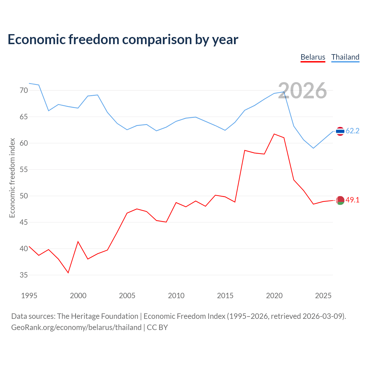The Economic Freedom Index for Belarus is 49.1, ranking 166/197, compared to 62.2 for Thailand, ranking 88/197. The chart above displays a comparison of annual changes in economic freedom indexes.