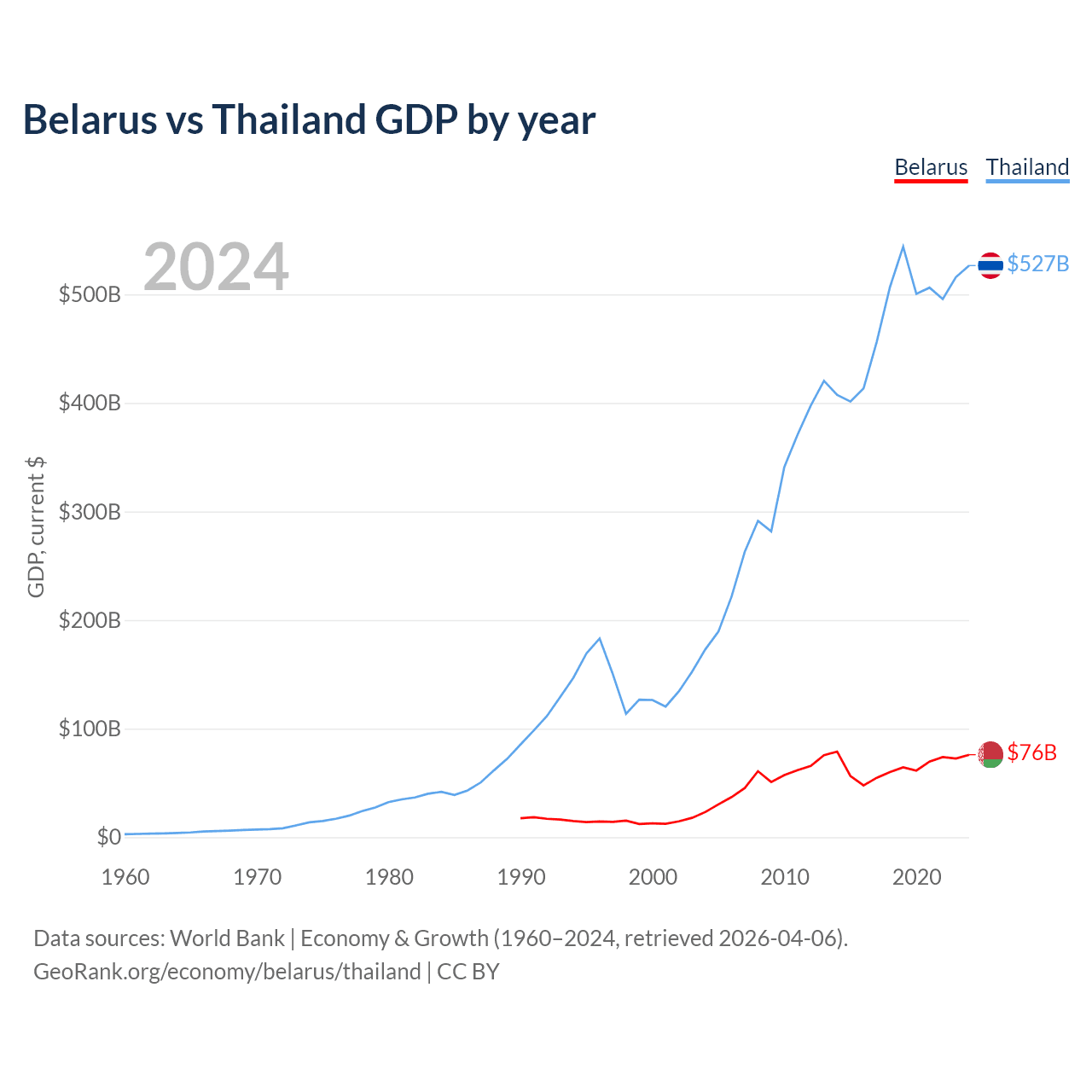 Belarus has a GDP of $76B compared to $527B for Thailand, ranking 83/197 and 31/197 by economy size, respectively.