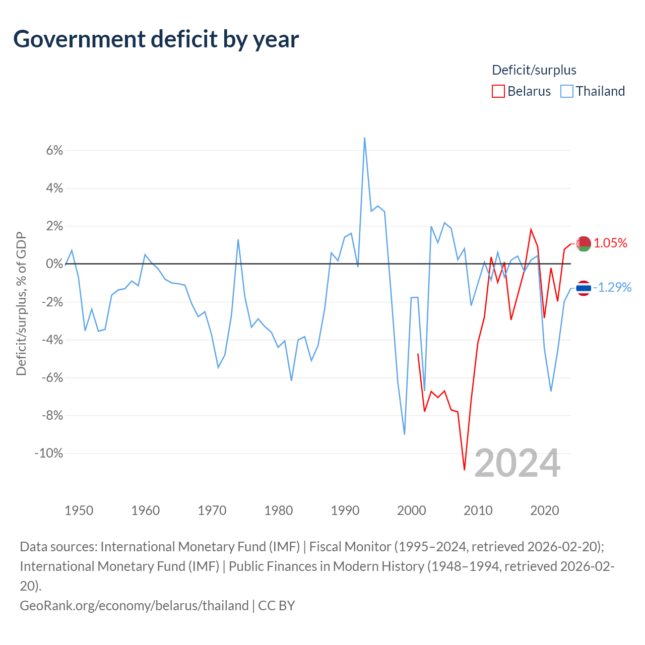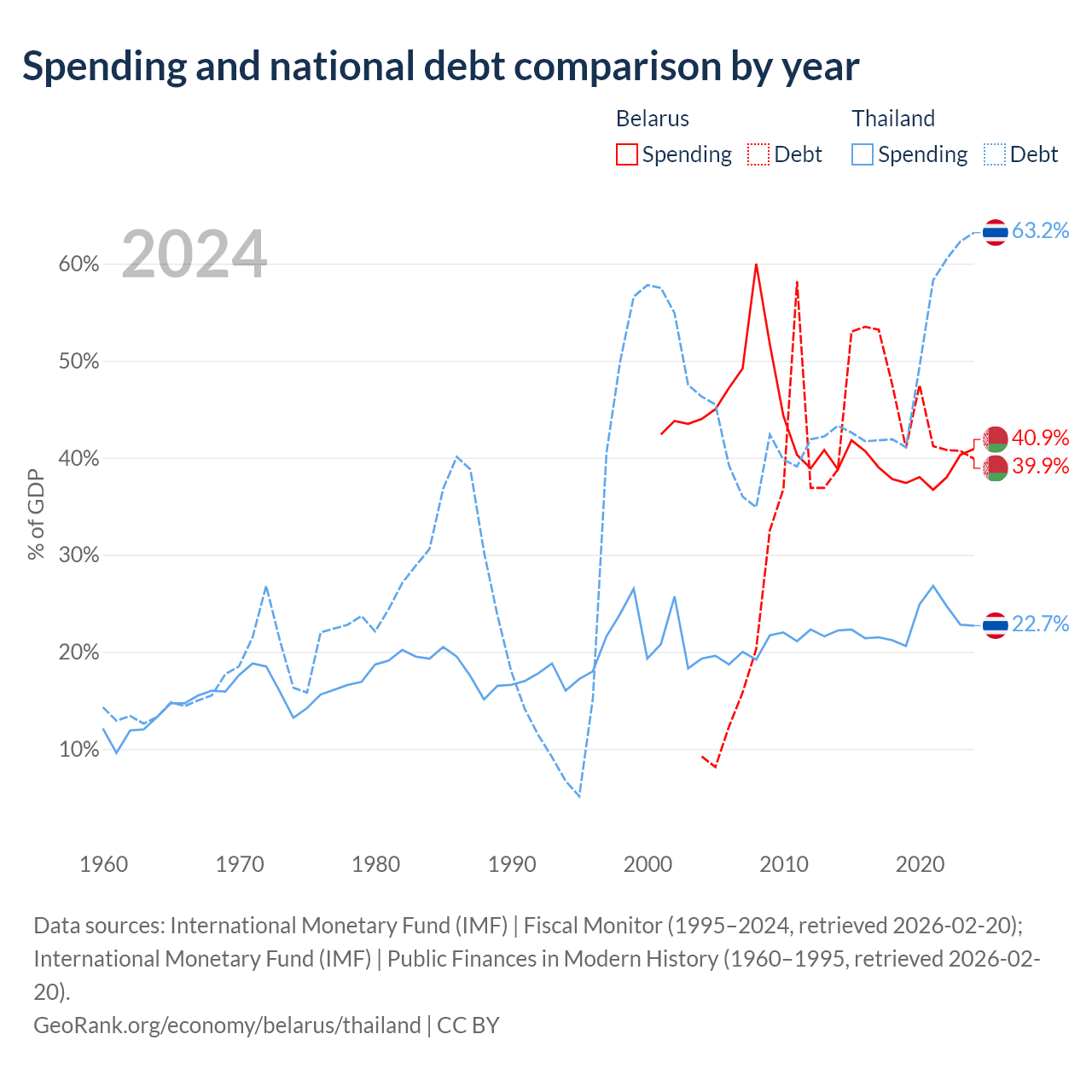 Belarus has $30.3B in government debt (39.9% of GDP), compared to $333B (63.2% of GDP) in Thailand.