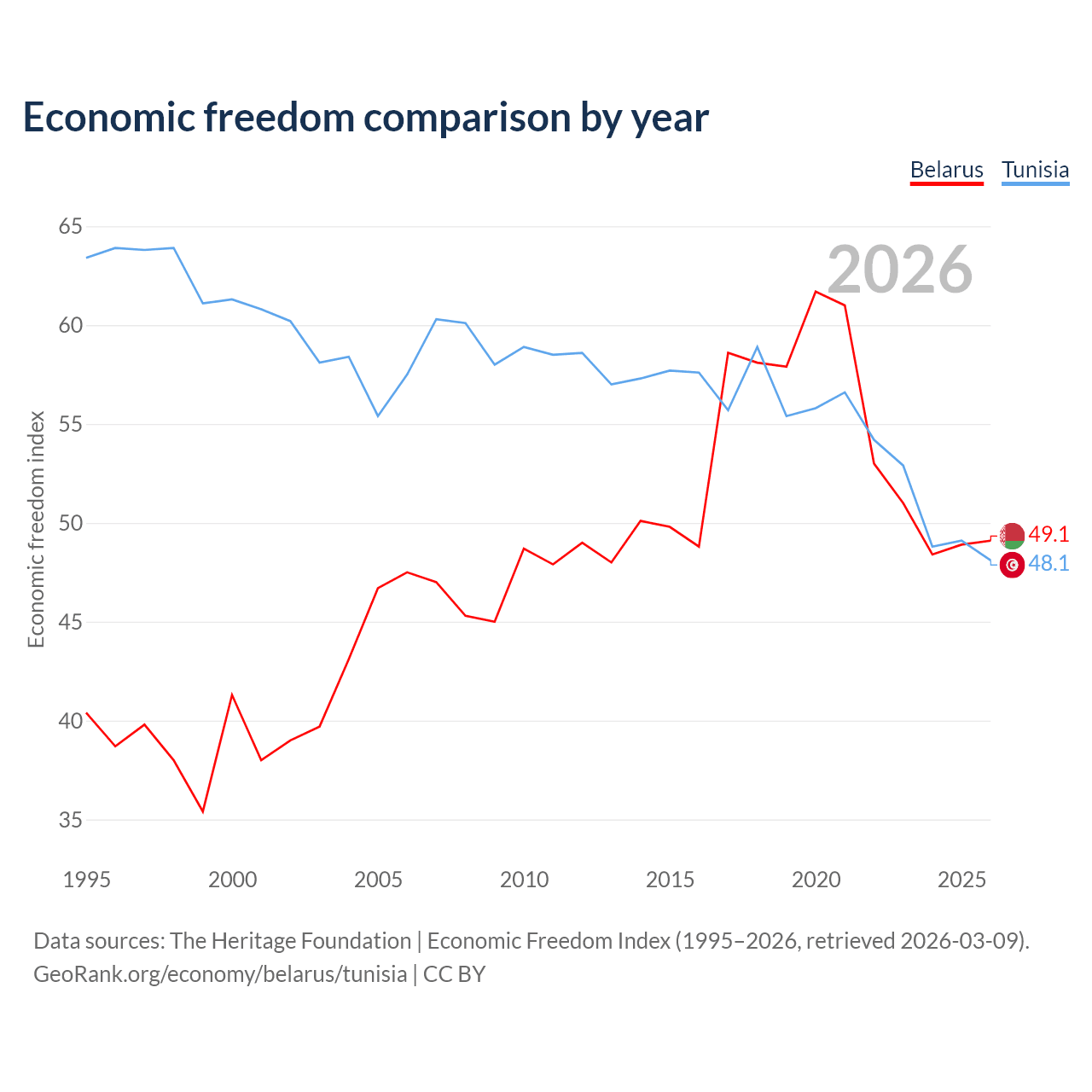 The Economic Freedom Index for Belarus is 49.1, ranking 166/197, compared to 48.1 for Tunisia, ranking 172/197. The chart above displays a comparison of annual changes in economic freedom indexes.
