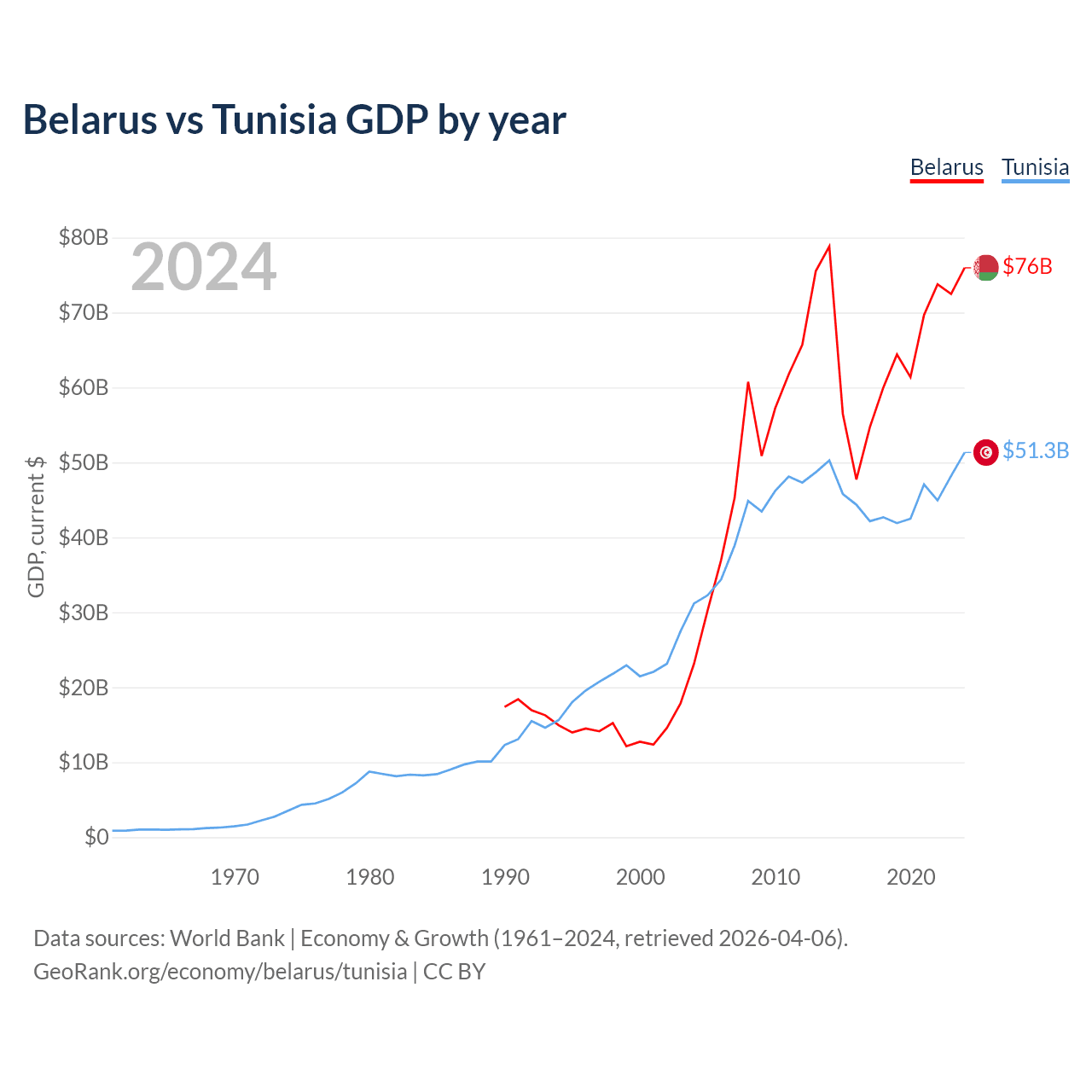 Belarus has a GDP of $76B compared to $51.3B for Tunisia, ranking 83/197 and 93/197 by economy size, respectively.