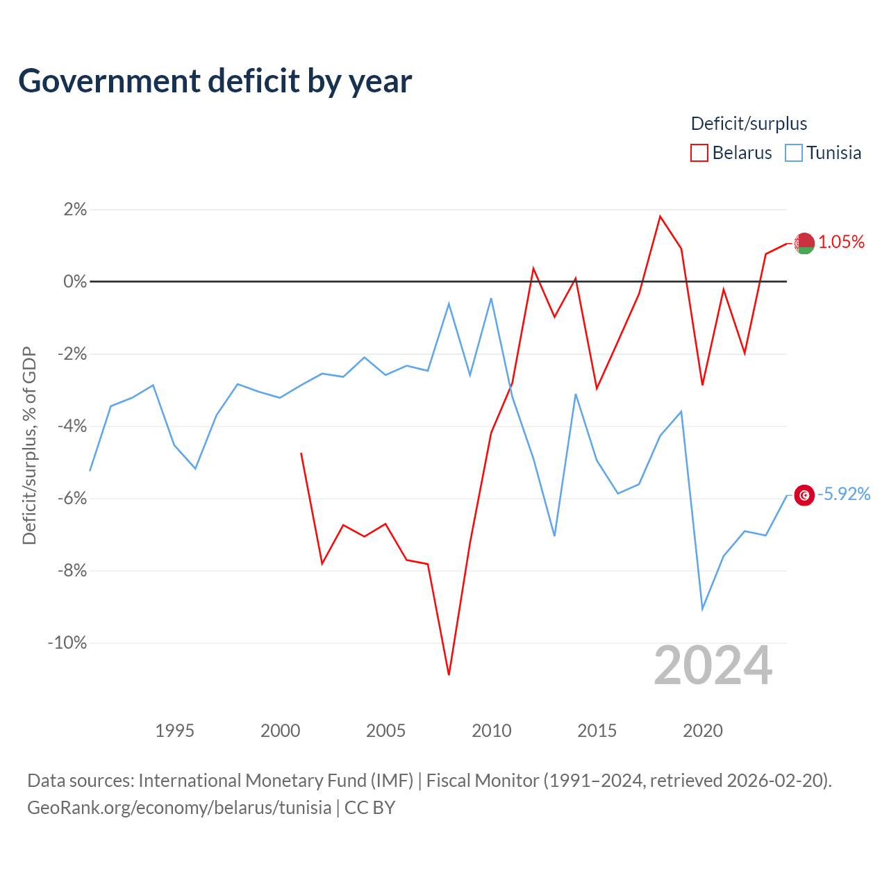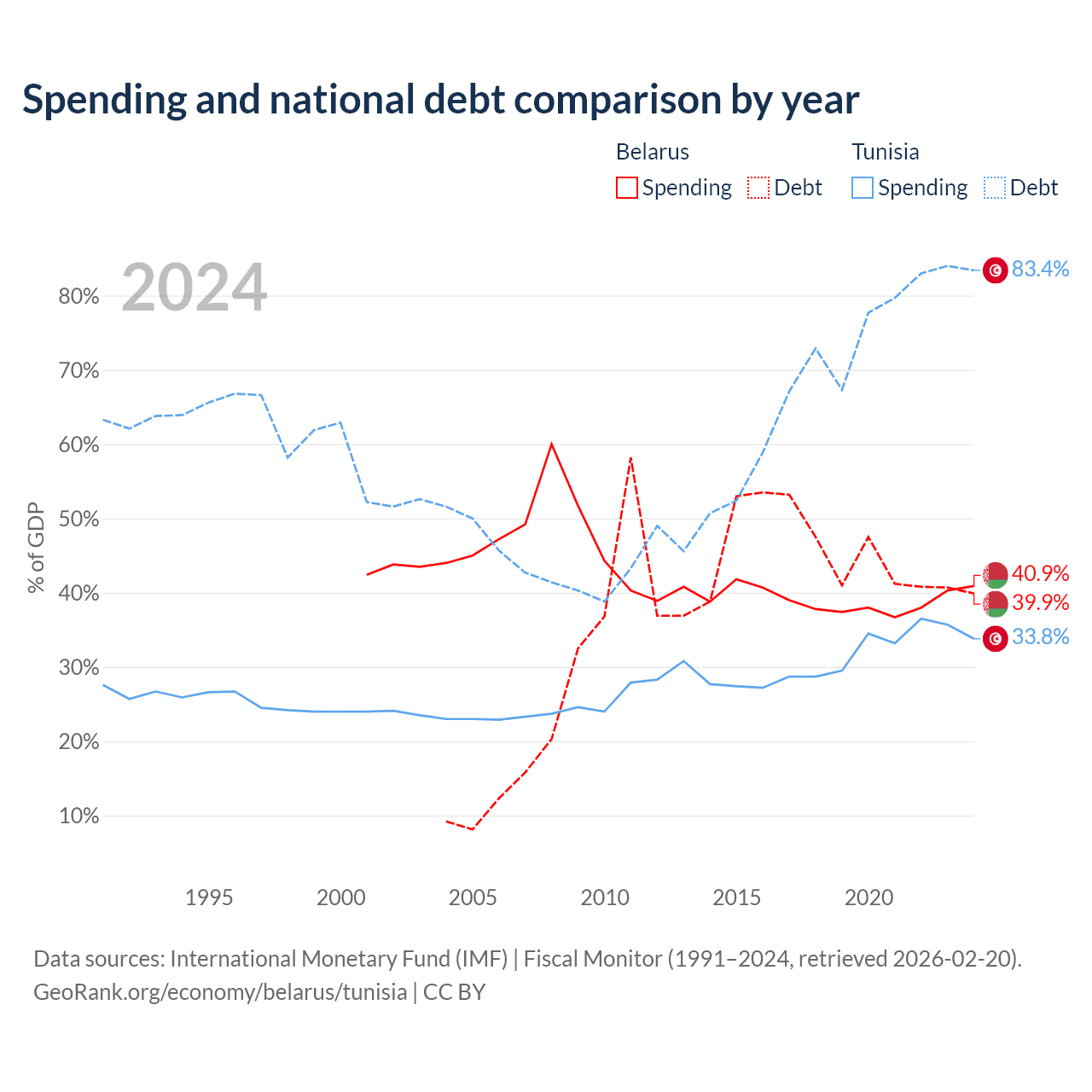 Belarus has $30.3B in government debt (39.9% of GDP), compared to $42.8B (83.4% of GDP) in Tunisia.