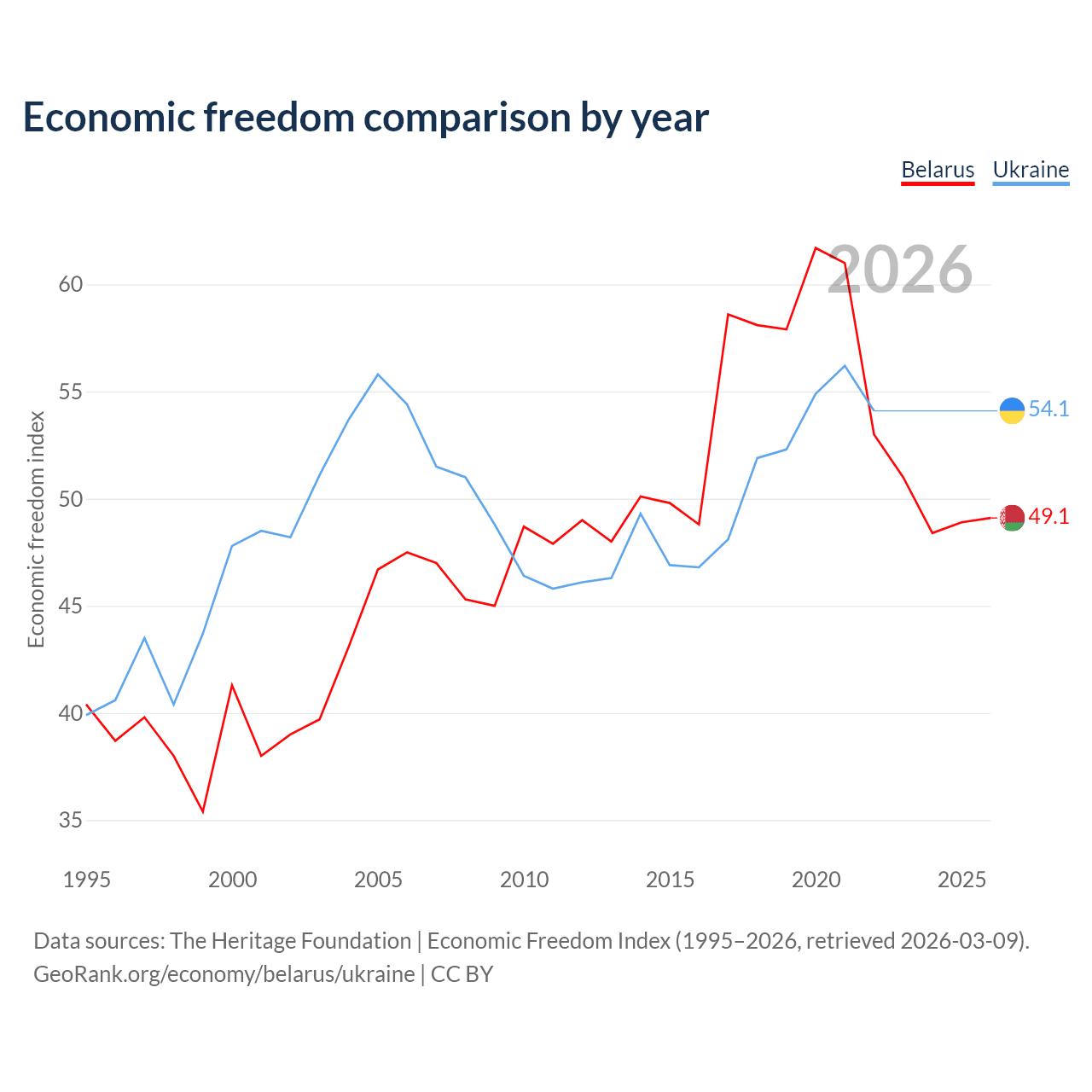 The Economic Freedom Index for Belarus is 49.1, ranking 166/197, compared to 54.1 for Ukraine, ranking 135/197. The chart above displays a comparison of annual changes in economic freedom indexes.